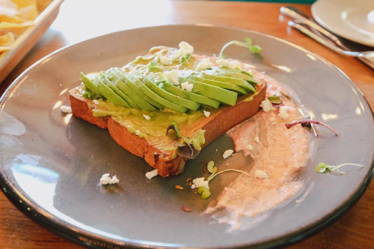 There’s also avocado toast available for $12 because of course there is. Smoky Rose’s take starts with a spread of guacamole over a thick slice of toast, then adds what appears to be another whole avocado, delicately sliced and fanned on top and finished with goat cheese crumbles. The whole contraption sits in a modest bed of beet hummus and can be a meal of its own if you’re in the mood for something light.