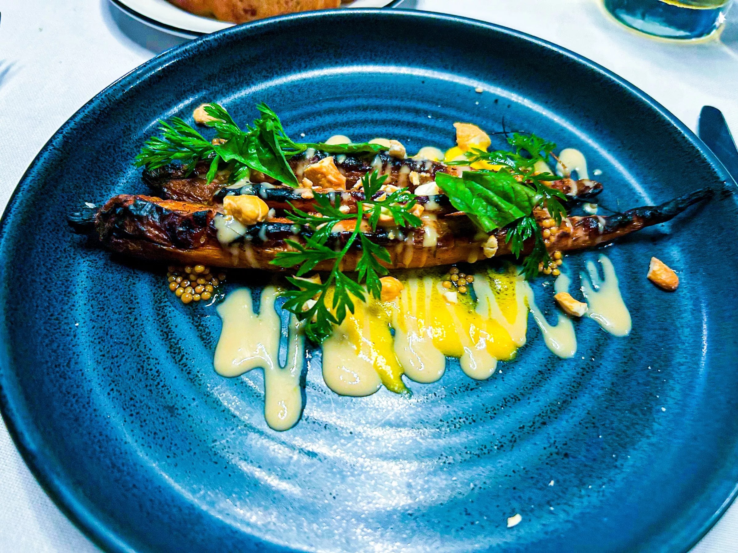 A bowl with two beef dumplings, one of the most popular menu items, comes as two fried pockets of HWD beerestinged in a white bowl with truffle gravy, which was too good to leave when the dumplings were finished. We used that bread we saved to scoop up the rest of it, which should be standard practice for every diner. The appetizer version of the beef dumplings are steamed and comes with the same gravy. We will definitely be trying that on our next visit. Charred carrots with mustard seeds and cashews. Brady Cole
