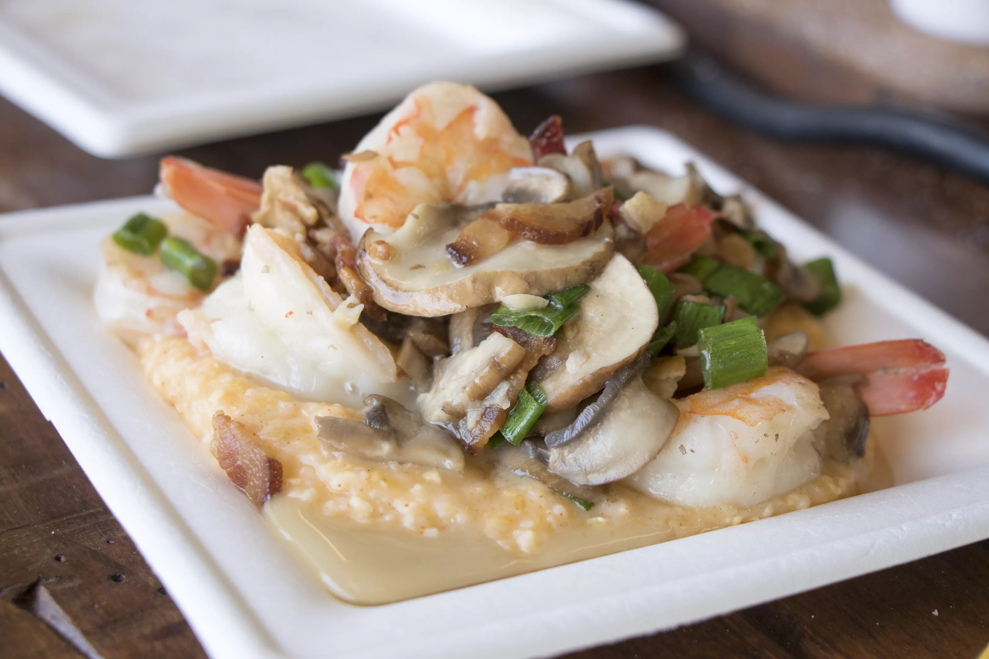 Patton Robertson, chef de cuisine at Cafe Momentum, made shrimp and grits. He cooked the bacon first, used leftover bacon fat to cook vegetables and suggested saving shrimp shells to make a stock.