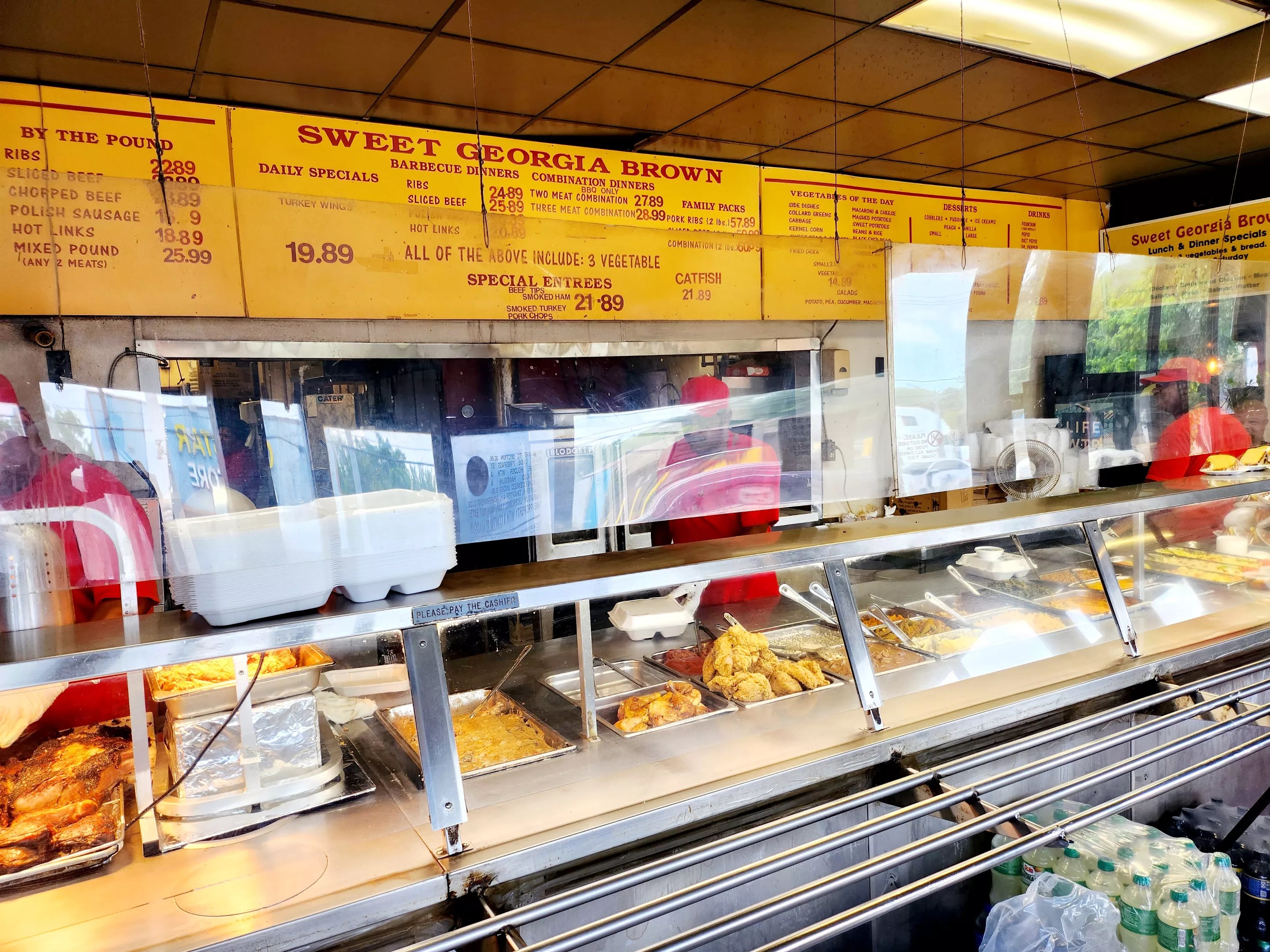 We stopped by midday on a Saturday and somehow walked straight to the head of the line; this was a stroke of luck as the line can snake well outside the door at Sweet Georgia Brown, especially on weekends and assuredly on Sundays after church. But the service is inviting and warm, and they operate with machine-like efficiency. After you’ve finished ordering, you’ll be handed your styrofoam box (or boxes) of food, which can barely contain the heaping portions. Then it’s time to move to a table, where they’ll bag everything for you (this is primarily a to-go establishment).