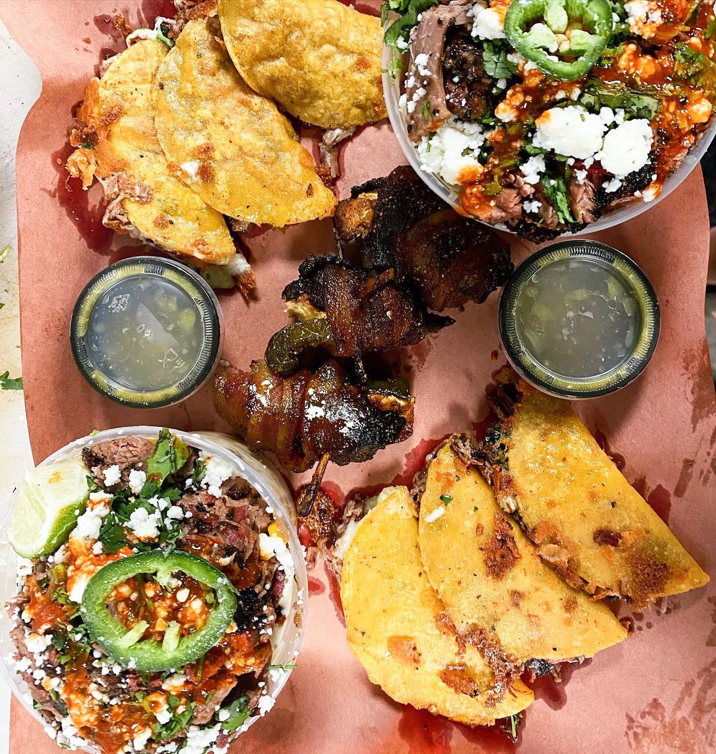 Sanchez began taking orders via social media and delivering them himself, offering pickup and curbside delivery. Sanchez has always offered a brisket taco along with meats by the pound on the menu. In June, Vaqueros was featured on the Cooking Channel’s show Man Fire Food; as expected, this immediately helped with business. He added tacos to the menu nearly a year ago – the brisket taco and birria tacos are the most popular menu items.