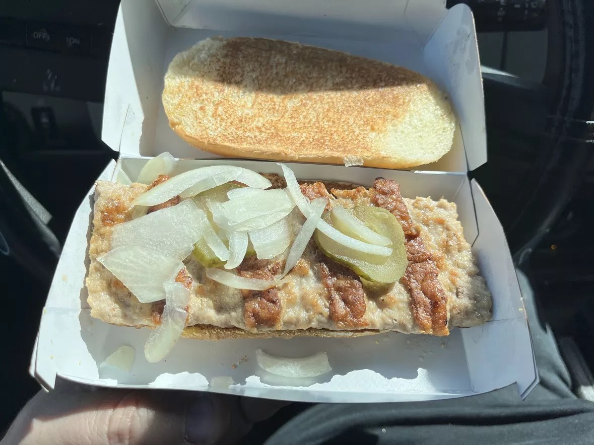 The container also holds a smattering of onions and pickle slices to give the dish a little more flavor.
