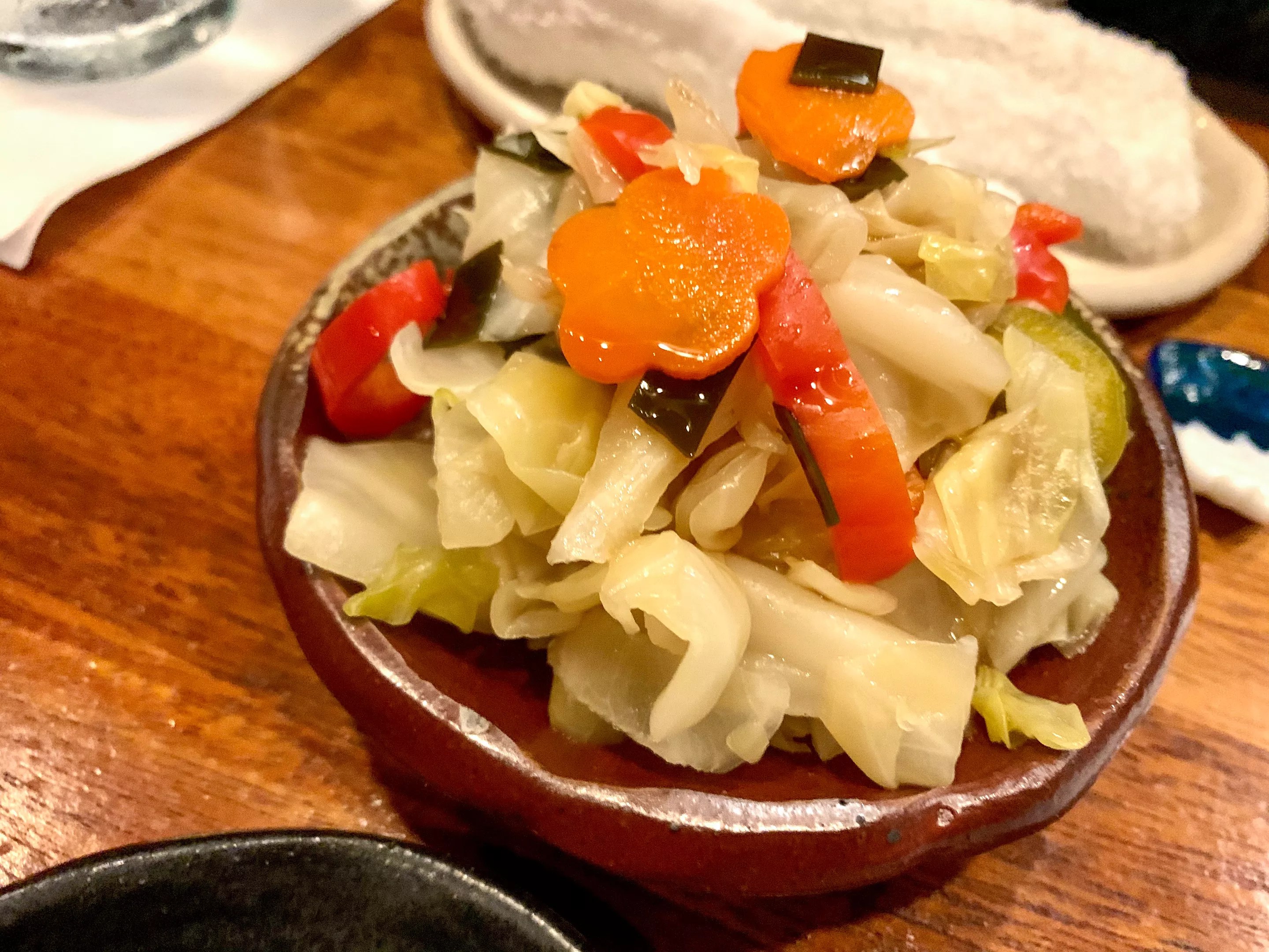 Chow chow: all the best pickling with cabbage, carrot, kombu and peppers, dressed in garlic soy.
