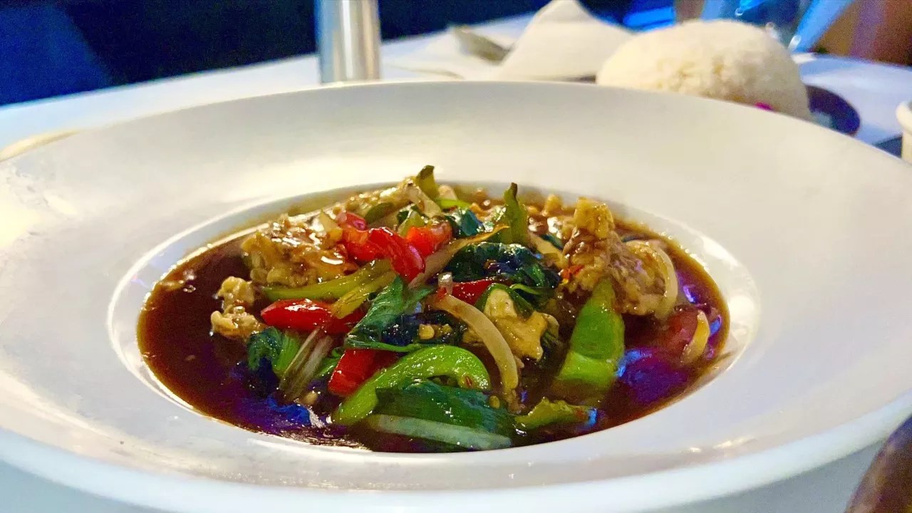 First up was an order of chicken satay ($8.95): tender, curry-marinated chicken strips on skewers served with a rich but not overpowering peanut sauce on the side. Following that was the Thai Opal glass noodle curry ($17.95), a bed of long, skinny translucent noodles sauced in curry with bean sprouts, onions, egg and beef. On their own, these noodles have a neutral flavor profile. But combined with Thai curry, they burst with flavor. If you’re looking to satisfy a noodle fix, this is your place. Flat noodles, rice noodles, egg noodles and even spaghetti noodles are on the menu.