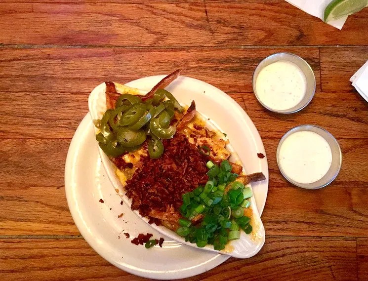 Cheddar fries, however, are iconoclasts. There should be a statue of a french fry capped in ranch, like a snowy mountain, on Greenville Avenue. Stretchy cheddar finds the acid of jalapeños under bacon topsoil. It’s a fork-and-knife french fry experience, and you’d have to have a blank soul to ignore its beauty.