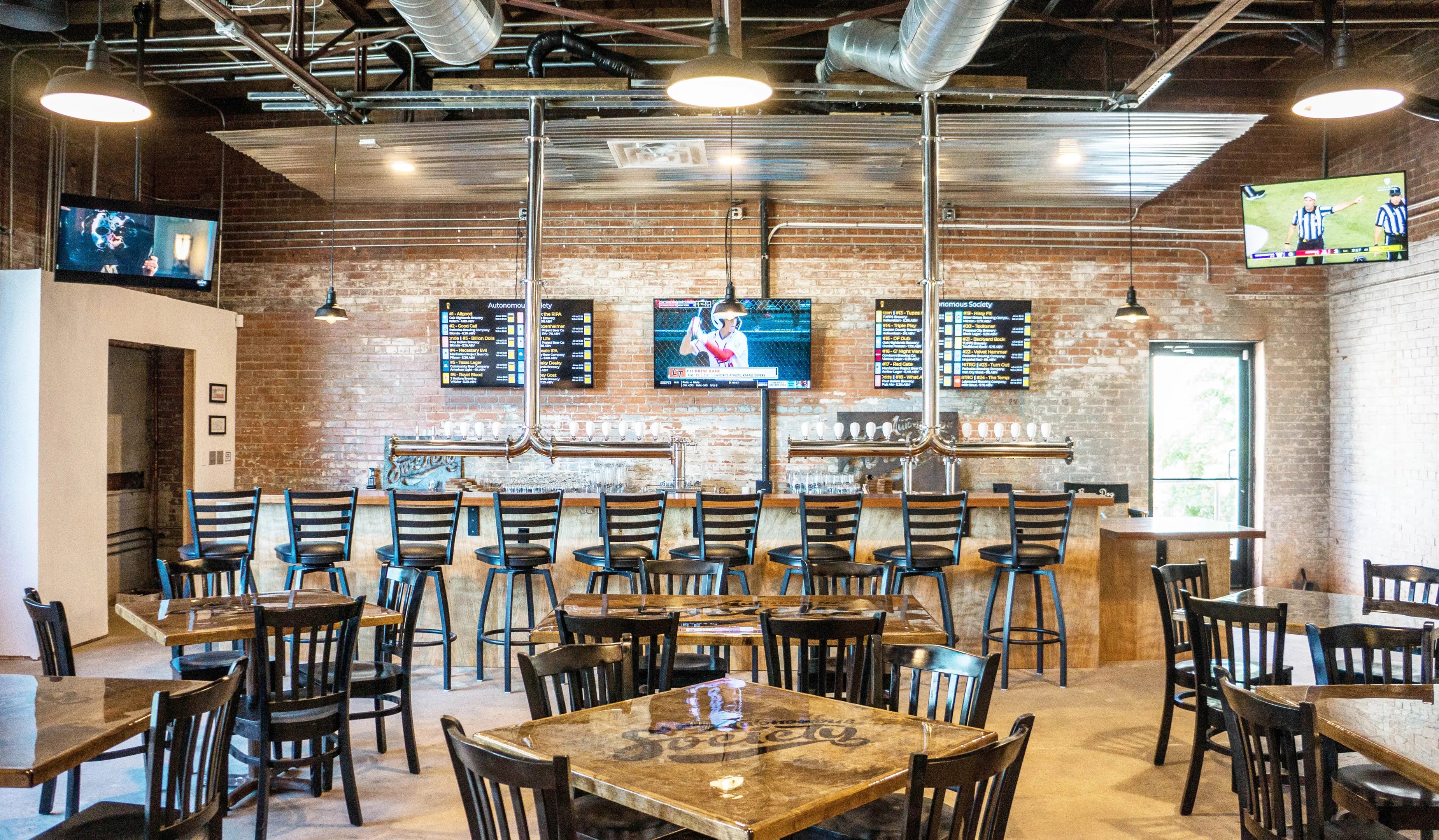The Autonomous Society brewpub has a big taproom and patio. They’ll have board games, dominoes and TVs broadcasting sports. Bonus feature: a large parking lot.