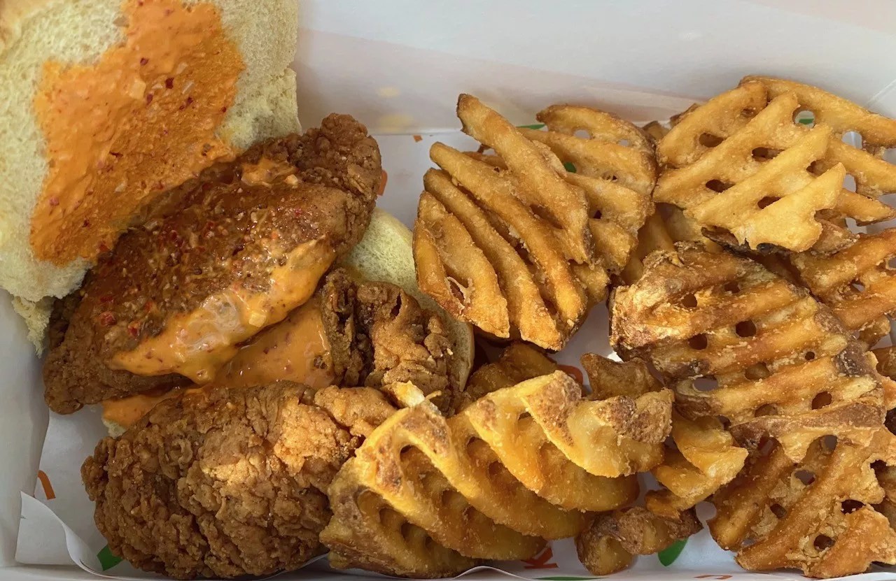 For $14.50, the waffle fries were inedible and a can of soda was tepid. Dull chicken strips came stuffed in a dry bun.