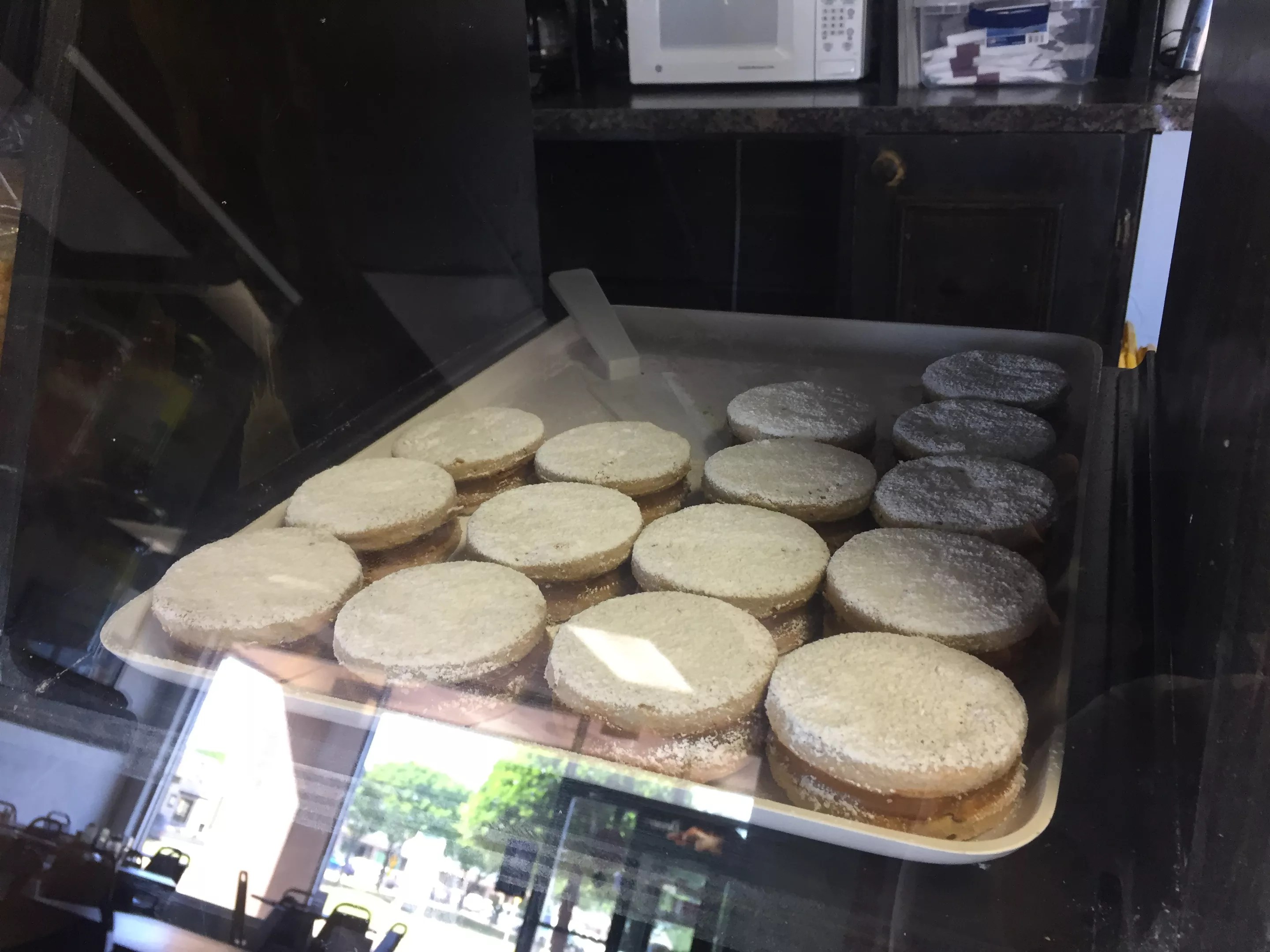 Alflajores, Peruvian cookie sandwiches filled with caramel and coated with powdered sugar.
