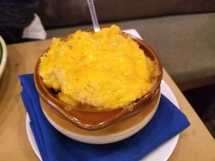 A side order of the cheddar and bacon hominy casserole ($4.95) did its part to redeem its brethren dishes. Here the hominy were turned into a gooey, cheesy mash the consistency of grits. Spiked with flavors of pimento and bits of bacon before being topped with more cheese, this little addendum had comforting flavor for days.
