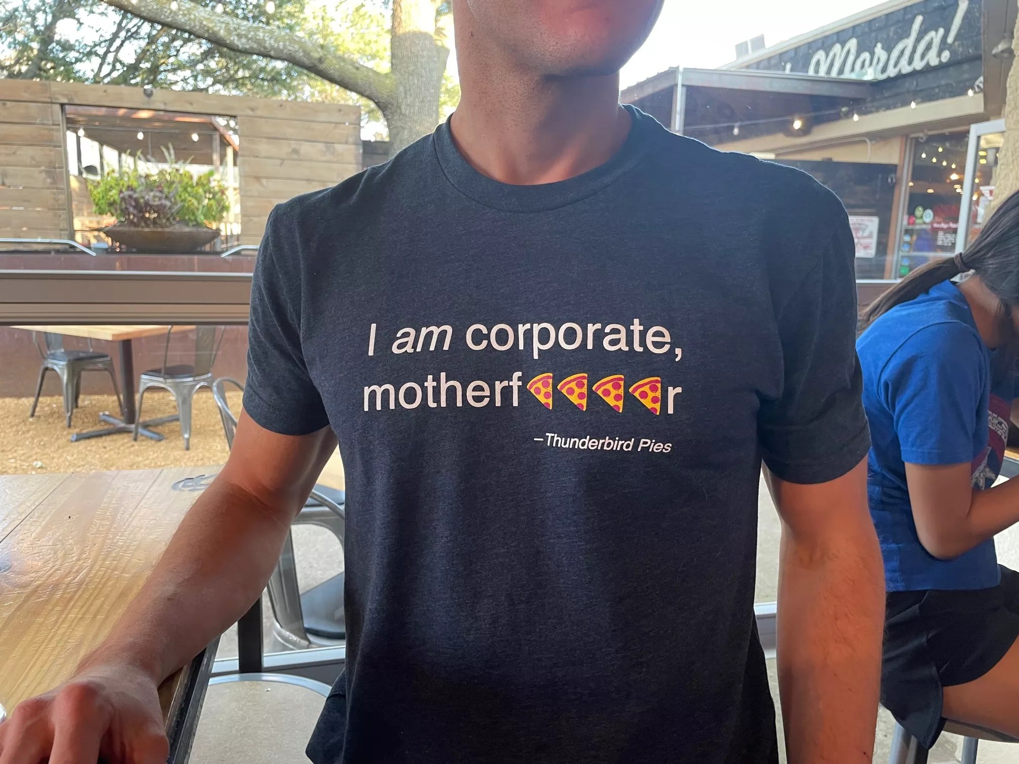 It all escalated quickly, with threats to call “corporate to let them know about the bullshit attitude towards customers.” To which Thunderbird Pies social media impresario, Jeff Amador, responded, “I am Corporate Motherf*****r.” Then they made shirts. But, more important: Tim was right. We need this pizza seven days a week.