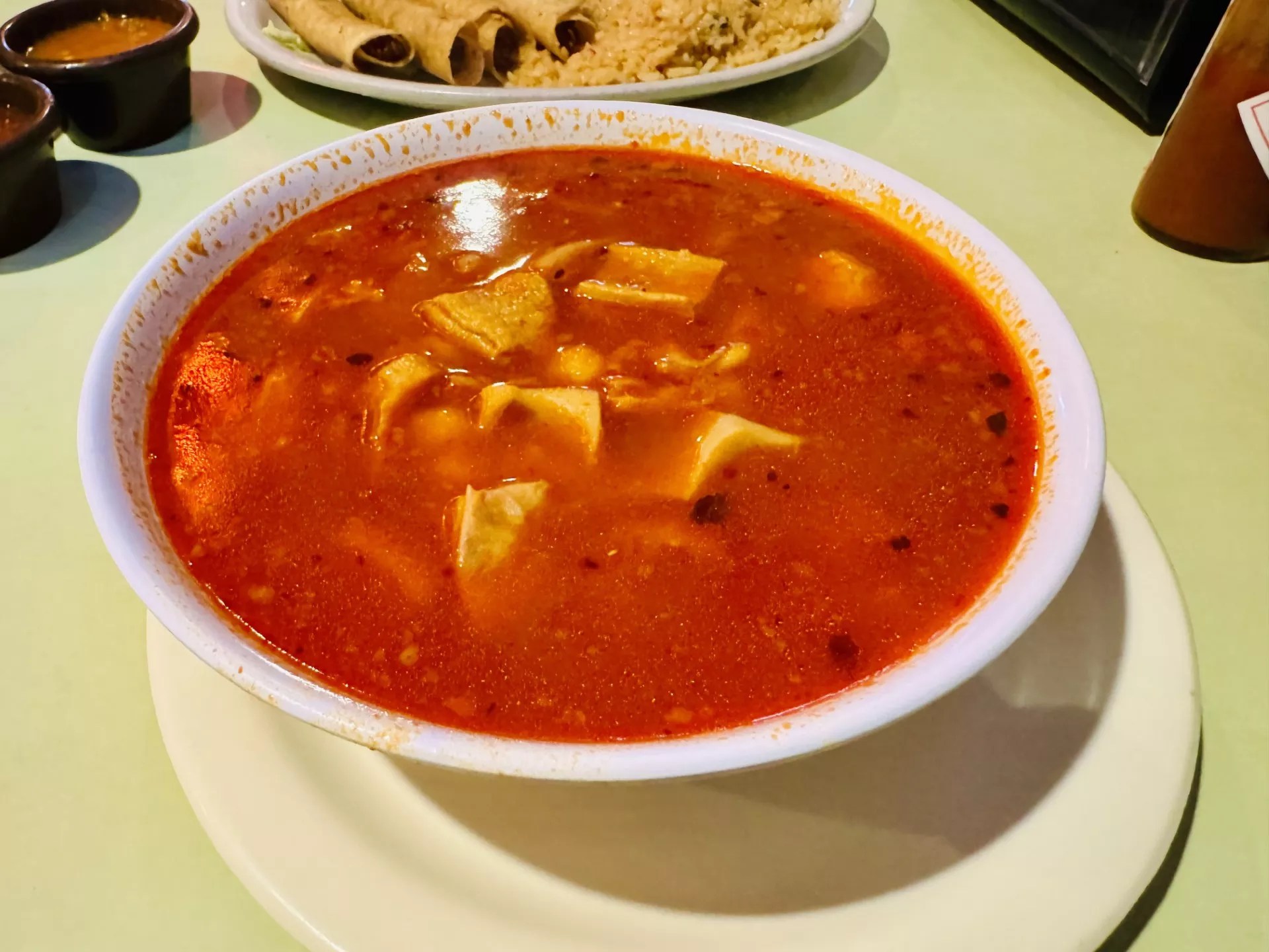 You’ll begin with the requisite complimentary chips and salsa. The house tortilla chips are absurdly fresh (as are the top-shelf tortillas made in-house), and the two salsas are stellar. We started with plates of crispy flautas ($8.25) and cheesy beef enchiladas. Both come with fluffy Spanish rice, refried beans, guac and sour cream. The beef enchiladas are a daily special (every Monday for $7.95). Daily specials, such as Tuesday chicken fajitas and Wednesday guisado de res (beef and potato stew) are featured during the work week and are priced at $7.95 (an absolute steal). Large bowl of menudo. Nick Reynolds