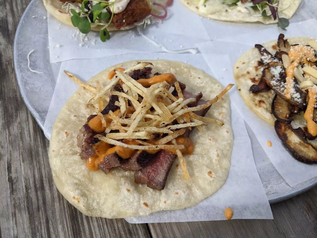 Take Resident’s newish steak frites taco, which, yes, piles steak and crispy-fried potatoes on a tortilla: Savoie developed a spicy, egg-free hollandaise sauce that functions as, and visually mimics, salsa. The result is a delicious cousin to classic carne asada.