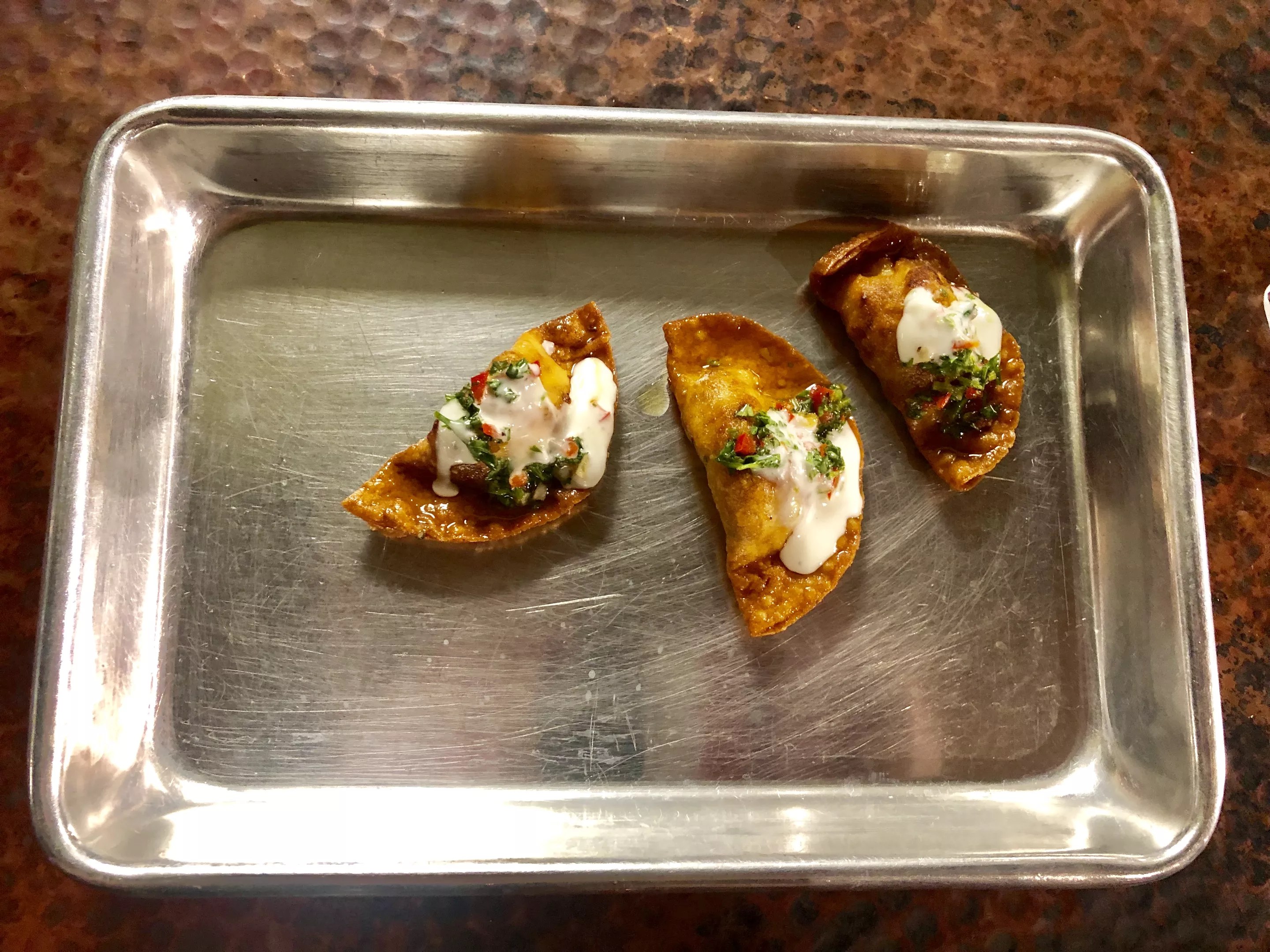 At Tutta’s recent vegan party, things got started with pizza dumplings: dough filled with 505 Hatch-peach barbecue jackfruit topped with housemade lime vegan crema.