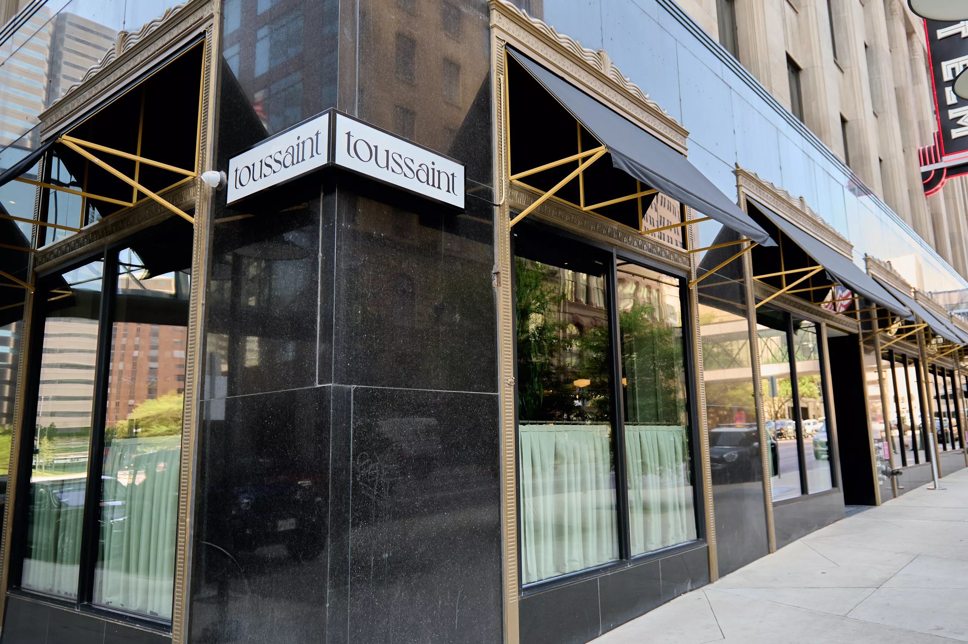 Facing Elm Street, the ornate brass window frames pop against the polished black marble of Toussaint’s exterior, with just a small sign announcing the restaurant’s presence at the corner of Elm and St. Paul. There’s an entrance directly into the restaurant on Elm, but for the full experience, take a few more steps down the sidewalk and enter through the Renaissance’s main entrance. Inside, art deco touches abound, from the chandeliers and furniture to the black and brass open shelving that separates the lobby from the restaurant proper.