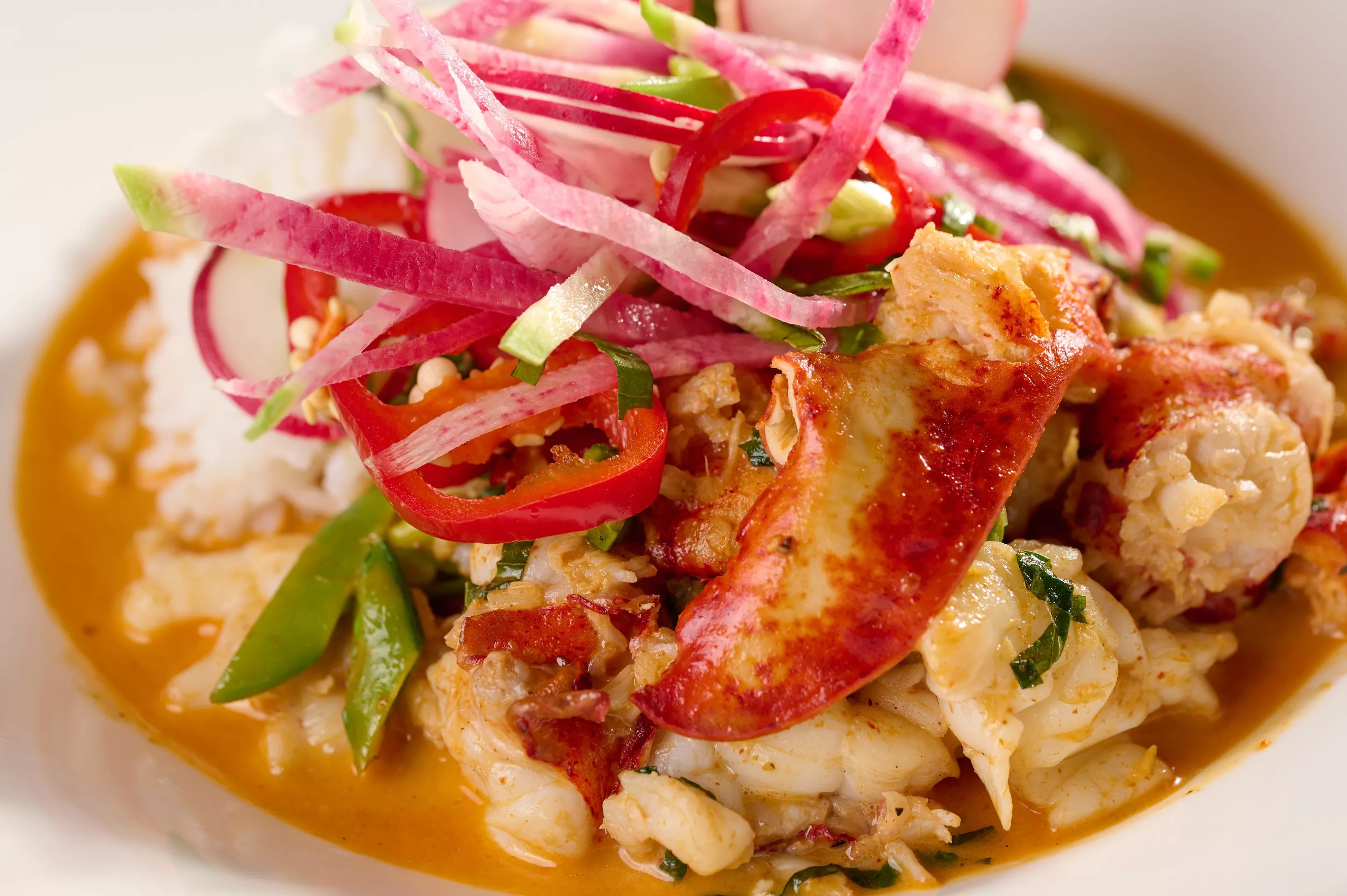 Toussaint’s take on lobster “thermidor” is made with curry combining French technique and Asian flavors.