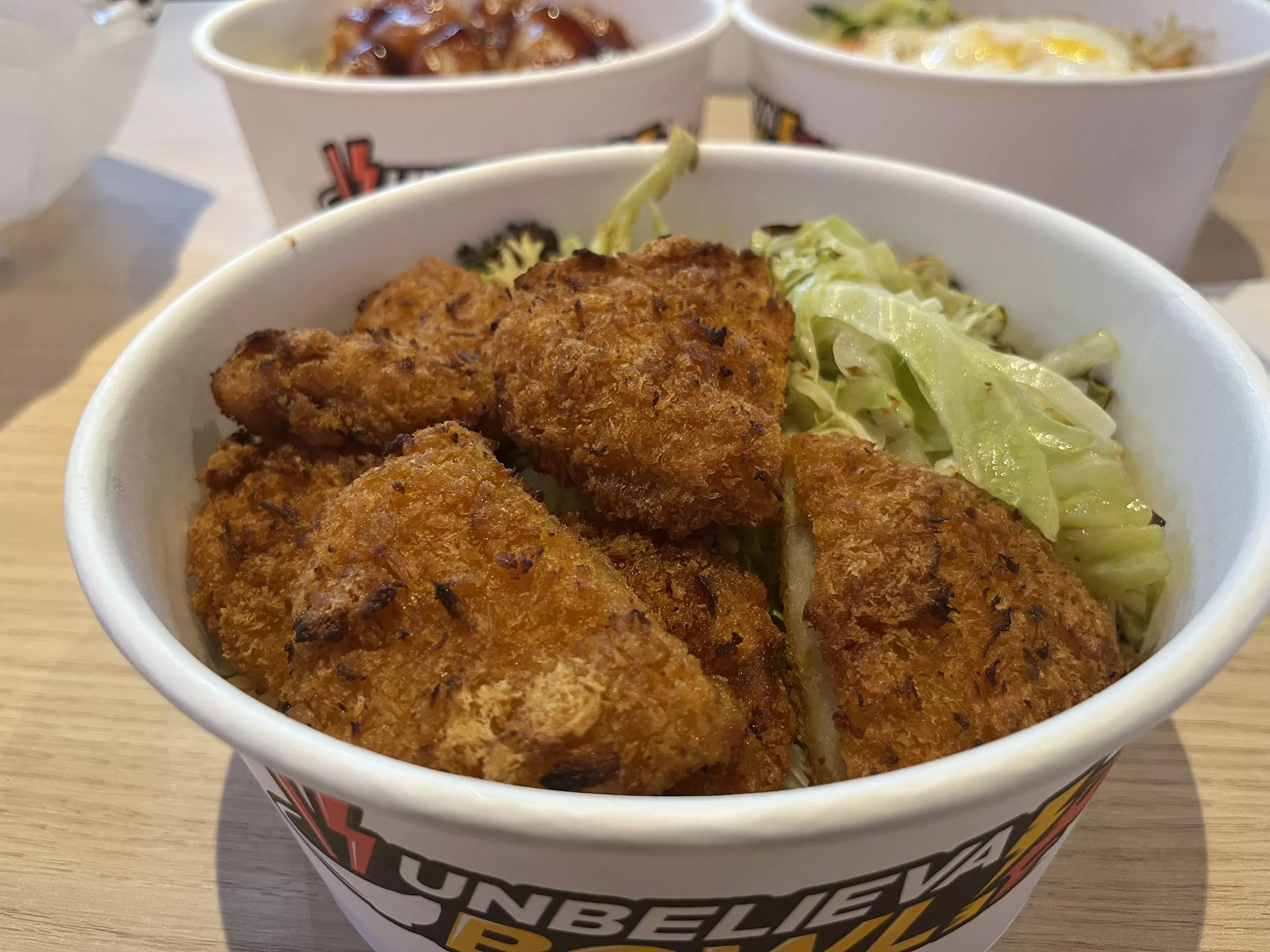 Unbelievabowl’s katsu is also a popular menu item, similarly served on a bed of rice and stir-fried vegetables. Go for the pork or chicken katsu ($8.95), which both come lightly breaded and fried on the outside but hide a satisfying center of tender meat within.