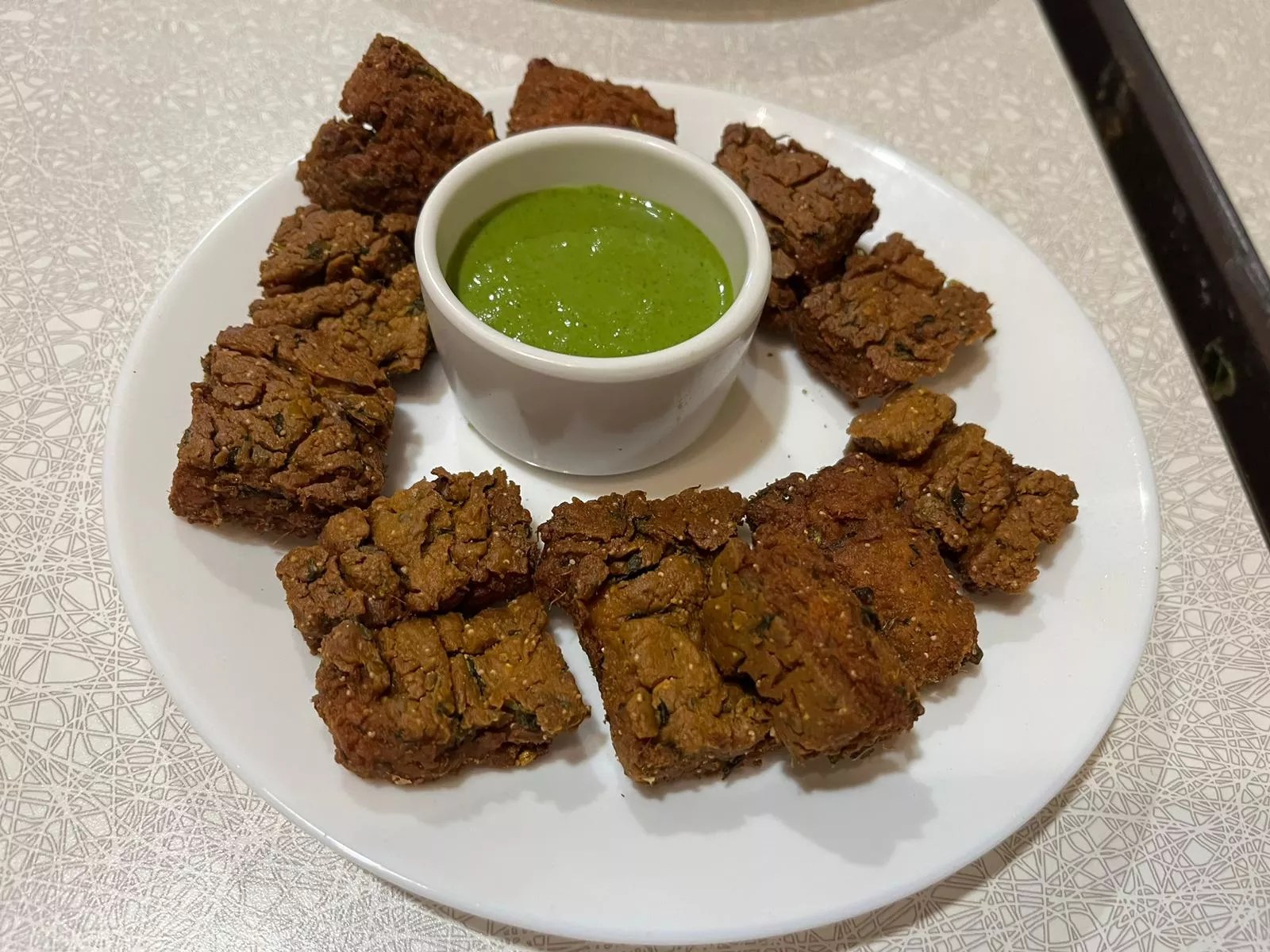 The Kothimbir Vadi dish comes with deep-fried gram flour cakes packed with nuts and spices.