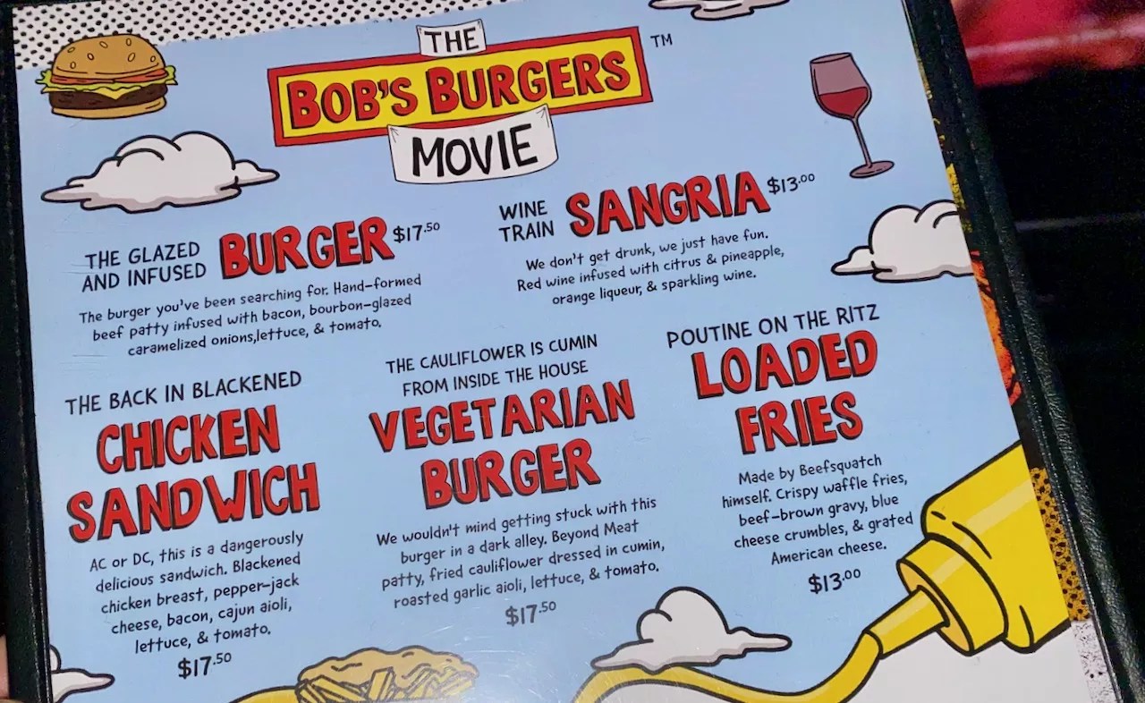 Alamo Drafthouse created an entire menu of Bob’s Burgers Burgers of the Day. Per the website “Bob himself” created these burgers, all of which are available while watching the movie. In a true dream fulfilled, we tried them all while watching the movie Monday evening.