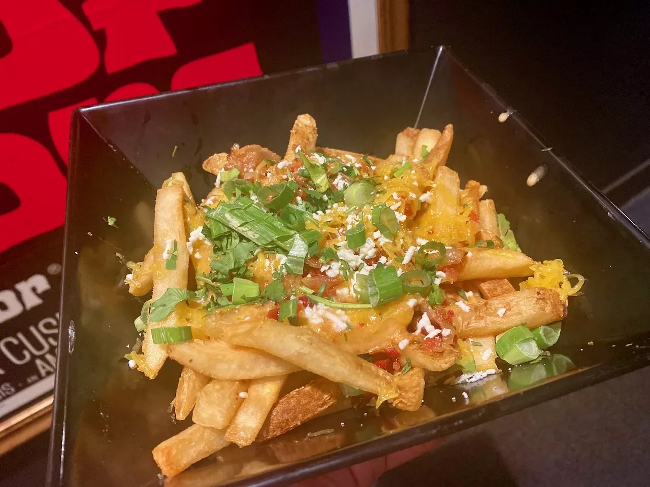 We started with the amazing Poutin on the Ritz loaded fries ($13). The thin French fries are extra crispy, covered in a beef brown gravy, blue cheese crumbles, grated cheese and crunchy green onions. And even though bacon wasn’t listed as an ingredient, we’re pretty sure there was some.