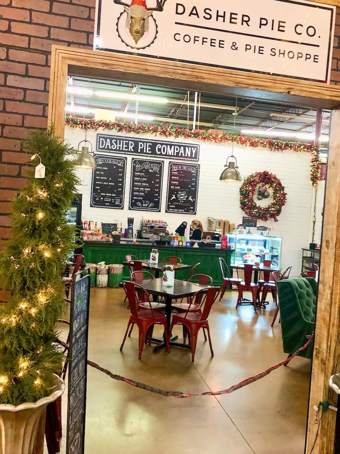 The woman working at Dasher Pie Co. the day I was there said Prancer is their most popular selection, a coconut cream pie. The namesake Dasher is a snickerdoodle buttermilk pie, and Rudolph is a white chocolate-cherry cream cheese. Finally, Mrs. Claus is an apple pie with a streusel topping.