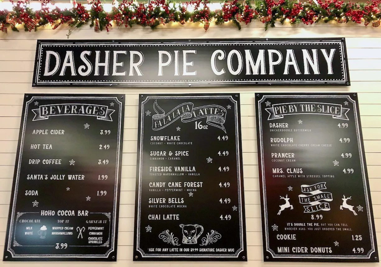The Dasher Pie Company is nestled deep inside the bosom of the Christmas kaleidoscope, in the far corner of the store. The menu includes a Hot Cocoa Bar, Fa-La-La-La Lattes, Santa’s Jolly Water, cookies and pie by the slice or the whole shebang.