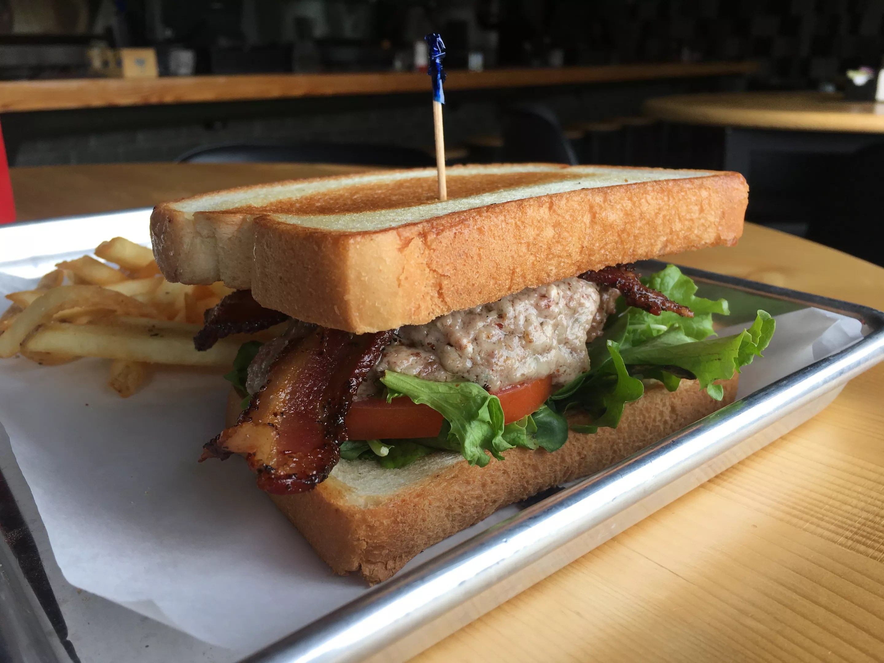 The bread’s fine. The bacon’s crispy and nose-clearing with pepper. The patty, an 80 percent Angus beef and 20 percent fat blend, is overcooked to the point of being stiff. The seasoning is there, but the overcooked, tough beef bums me out. Jay Burchard, sous chef and kitchen manager, confirms they’re using fresh beef, and it’s fired over the flames of a grill. The patty, which looked pale almost like it was steamed or loaded with more fat, is seasoned with their own blend of spices, including pepper, salt and brown sugar. Some of the patty’s leftover juices hang out with the tomato and lettuce, but the rest have disappeared into a black hole.