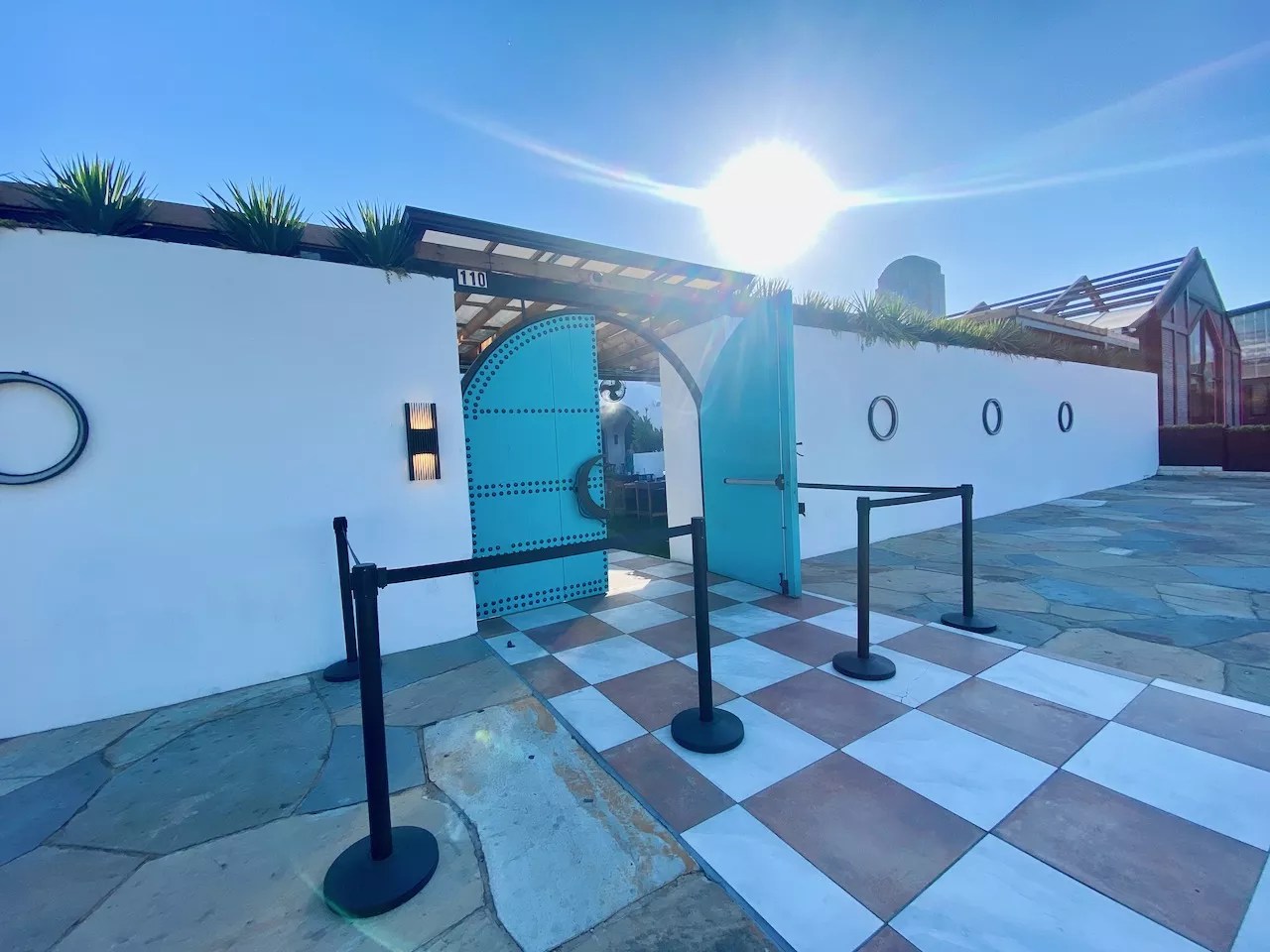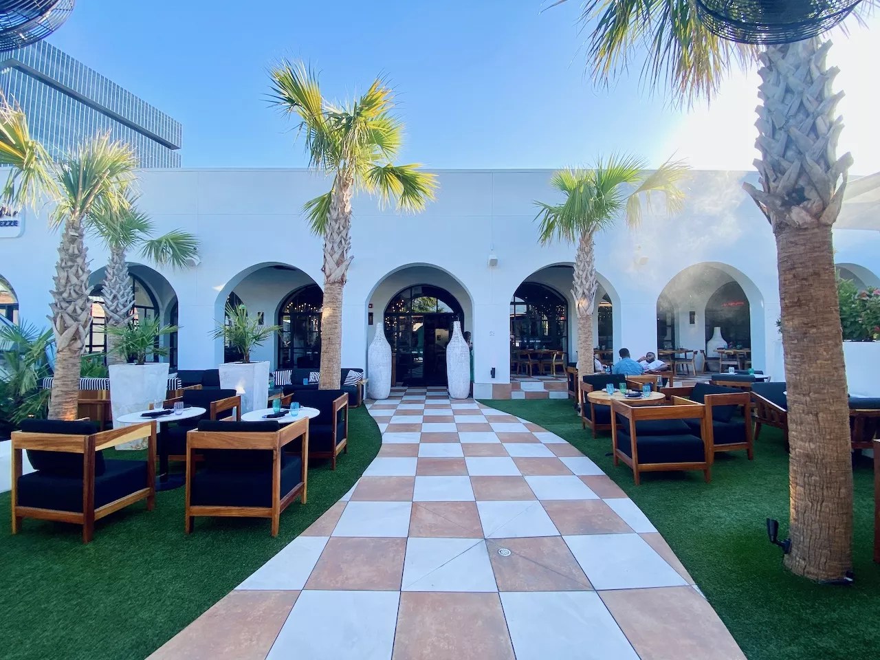 With the sun starting to set over the restaurant’s roof, we walked past a large wall and through the aqua-blue doors. Saaya definitely gives off that oasis feel. Bright tiles mark a winding path past an astroturf courtyard dotted with lounge-like seating and tables with palm tree leaves swaying in the wind from massive fans and misters overhead. A covered patio with Mediterranean-style arches offers shade for al fresco dining. Inside is a mix of lounge seating and a big, U-shaped, slick marble bar with starry lighting overhead. Half of the restaurant is a regular dining room. The servers, all female from what we could see, wear flowing vibrant dresses.