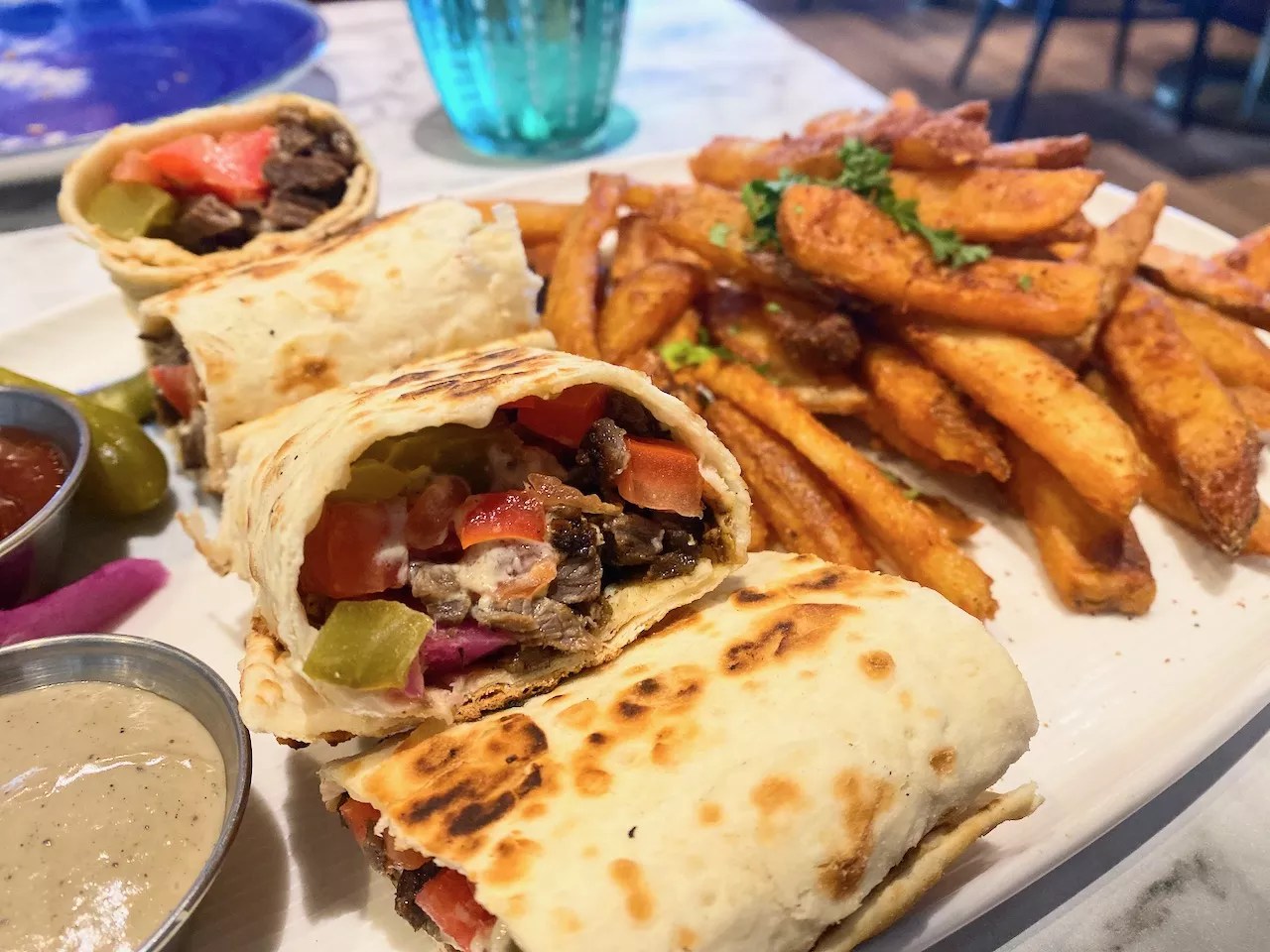 Only teased by the idea of food at this point, next we went with something a bit more substantial: a plate of beef shawarma ($15) with lavash (thin flatbread), tomatoes, pickled turnips, cucumber, garlic aioli, tzatziki and sumac fries. The wrap was very good, with tender beef and tangy vegetables all nestled in a toasty warm lavash. A grayish condiment was hard to identify and didn’t really have much of a flavor. But those sumac fries were amazing. For the price point, this was a good meal.