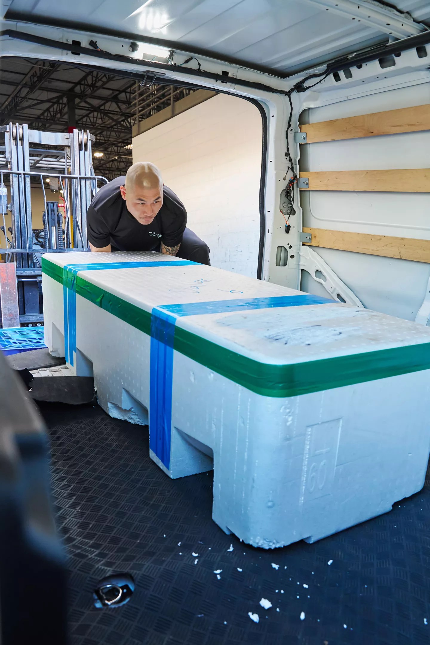 “We have to rent a truck from U-Haul,” Mabuchi says. “The fish is wrapped in a silver [thermal] bag, and they pack it in ice inside of a large styrofoam box.”