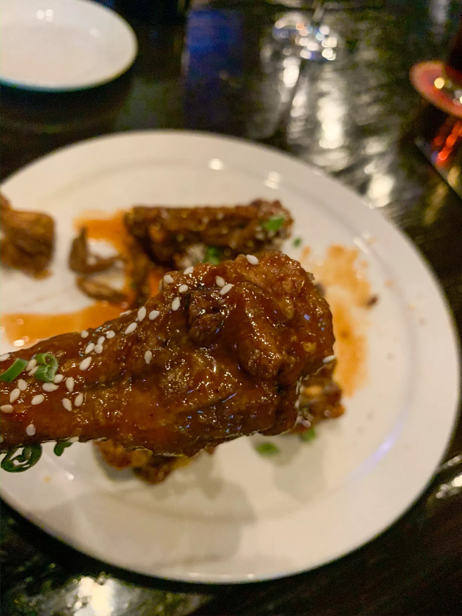 One plate comes out with six duck wings covered in a wonderfully sticky sauce. (Wonderful while eating, though you will want to wash your hands afterward; the napkin’s not enough.)