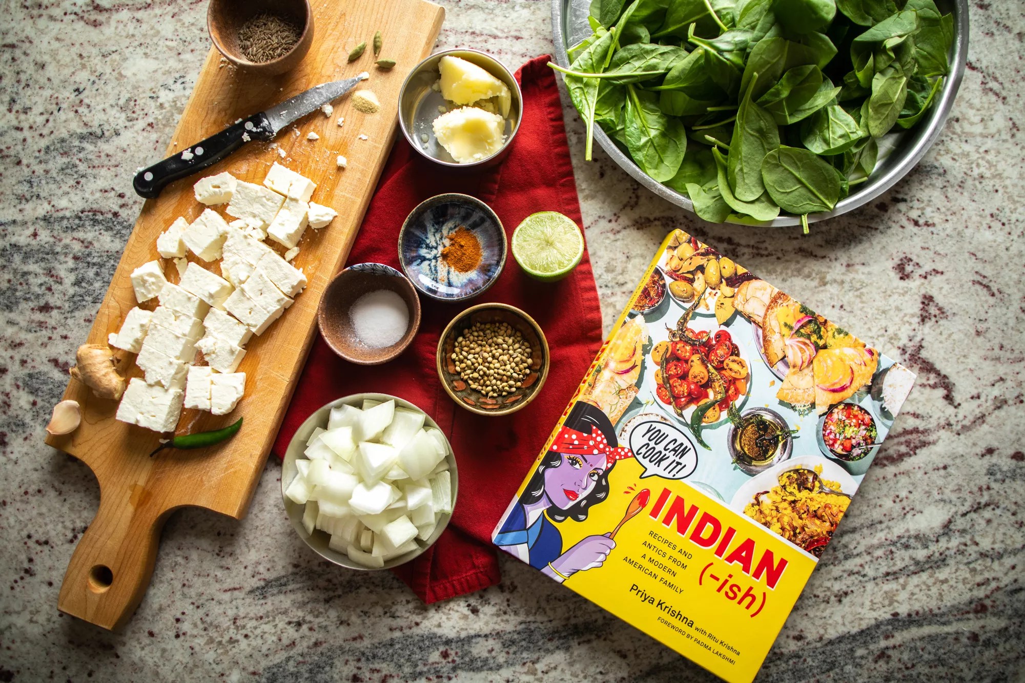 On the kitchen island, Priya Krishna’s new cookbook Indian-ish is open to a food-splattered page that is attempting to teach me how to make spinach and feta cooked like saag paneer, a Western riff on a beloved Indian takeout dish of paneer cubes in a bright spinach gravy. My boyfriend wanders through the kitchen a few times, looking inquisitively over my shoulder. He’s seen me cook many things in this kitchen – most successfully, some not – but he’s never seen the small mountain of whole spices and seeds spilling out onto the counter.