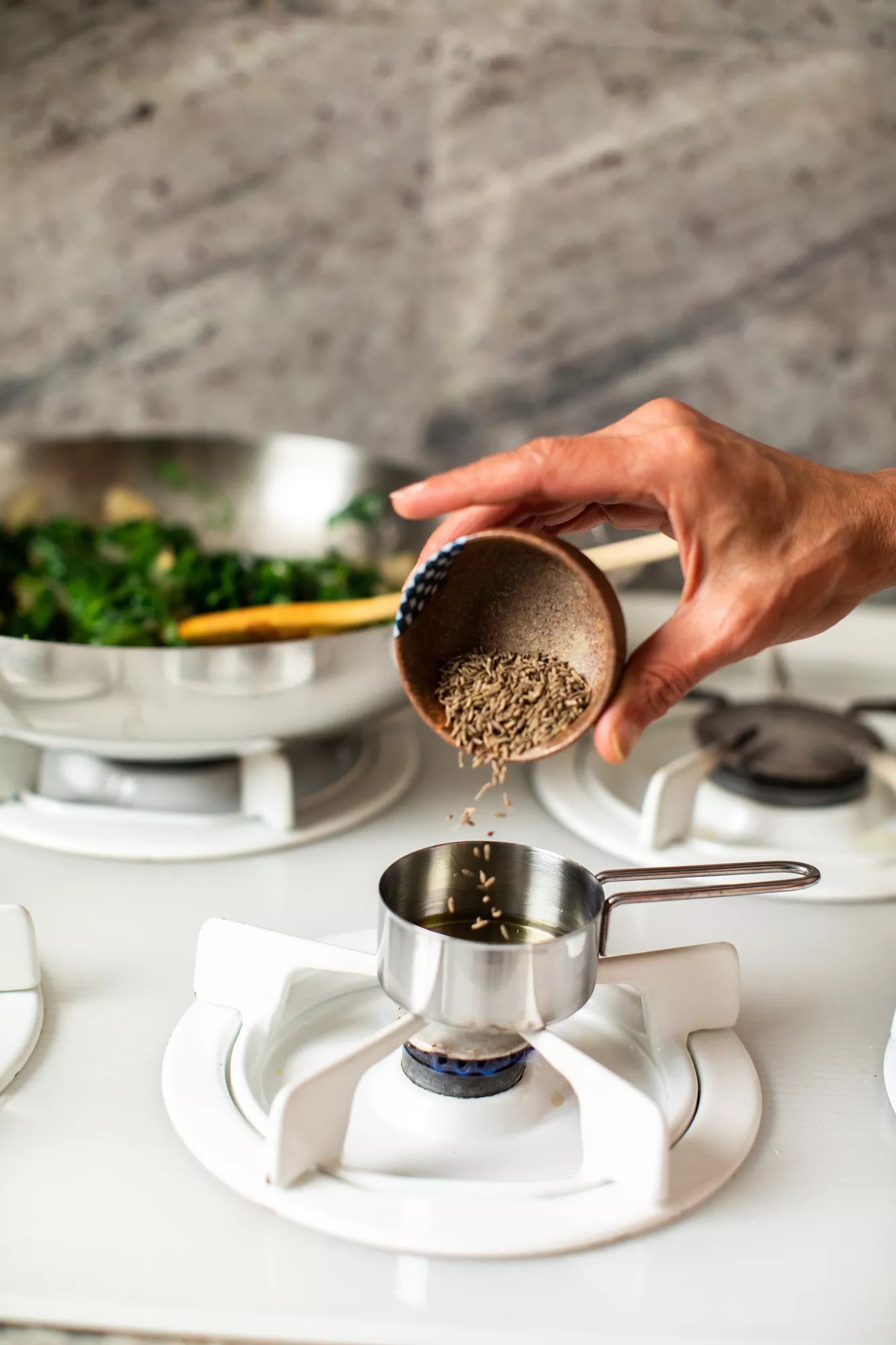 Ritu Krishna toasts spices in ghee.