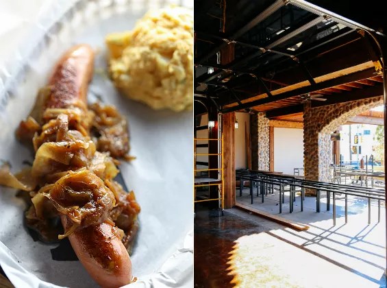 The interior is small. Dark accent paneling climbs halfway up the red brick walls, which are adorned by a handful of flat-screen TVs. A copper-top bar spans the entire space, and two clear garage-style doors divide the interior from the half-covered patio, where most of the seating is. The menu, like everything else, is German-themed. […]