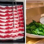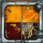 Chinese hot pot is similar in many respects to fondue: it’s an interactive dining experience where the center of table contains a simmering pot of soup into which various raw ingredients such as veggies, meat, seafood, tofu, etc., are placed for quick cooking. The ingredients are sliced thinly to facilitate the fast-cooking process, and the soup can be flavored as well. The cooked items are then usually dipped into some sort of sauce prior to eating.