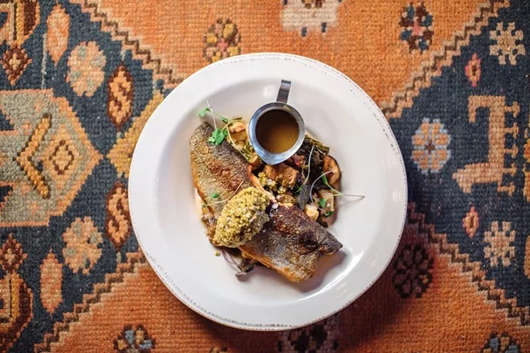 Among the veggies are roasted celery root and sunchokes, a scattering of charred sweet corn and, stealing the show, outrageously good collard greens served with the pot liquor.