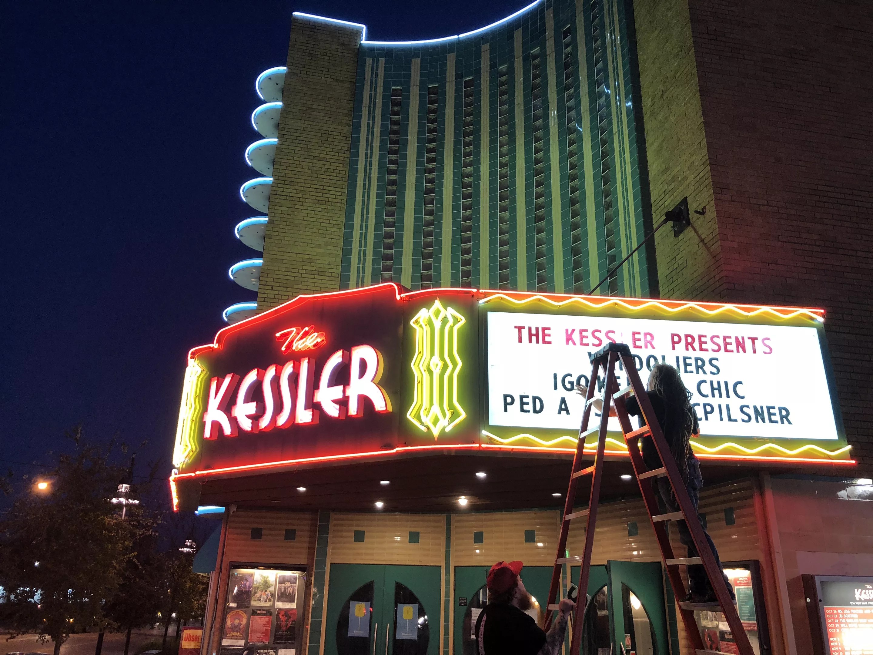 At the Kessler, shows usually start at 8 p.m. with doors at 7, so we head back to the theater around 6, just as the sun is slipping below the horizon. Liles notices something off on the marquee, so he and a staff member fetch a ladder, and Liles climbs up to move the letters into place.