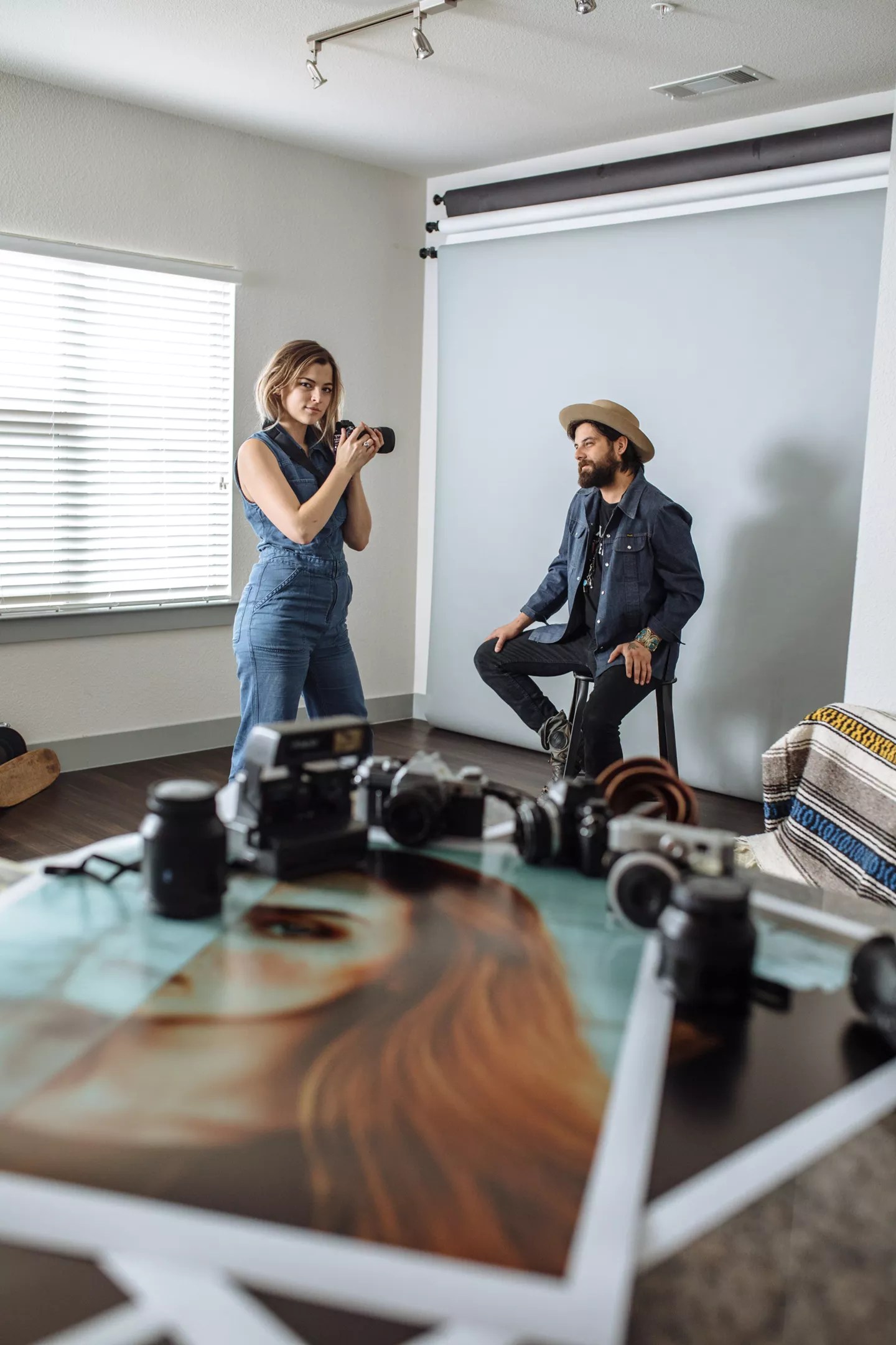In May, the couple left a “musician house,” where they were living with Dan Bowman of Fox and the Bird and Jacob Metcalf, and moved to the Oak Cliff building. In true photographer fashion, they chose their new place for its generous lighting. They also liked its close proximity to the Belmont Hotel, a refuge for creatives and a place where the couple shoots frequently. The Belmont is also the spot where they shared their first kiss.