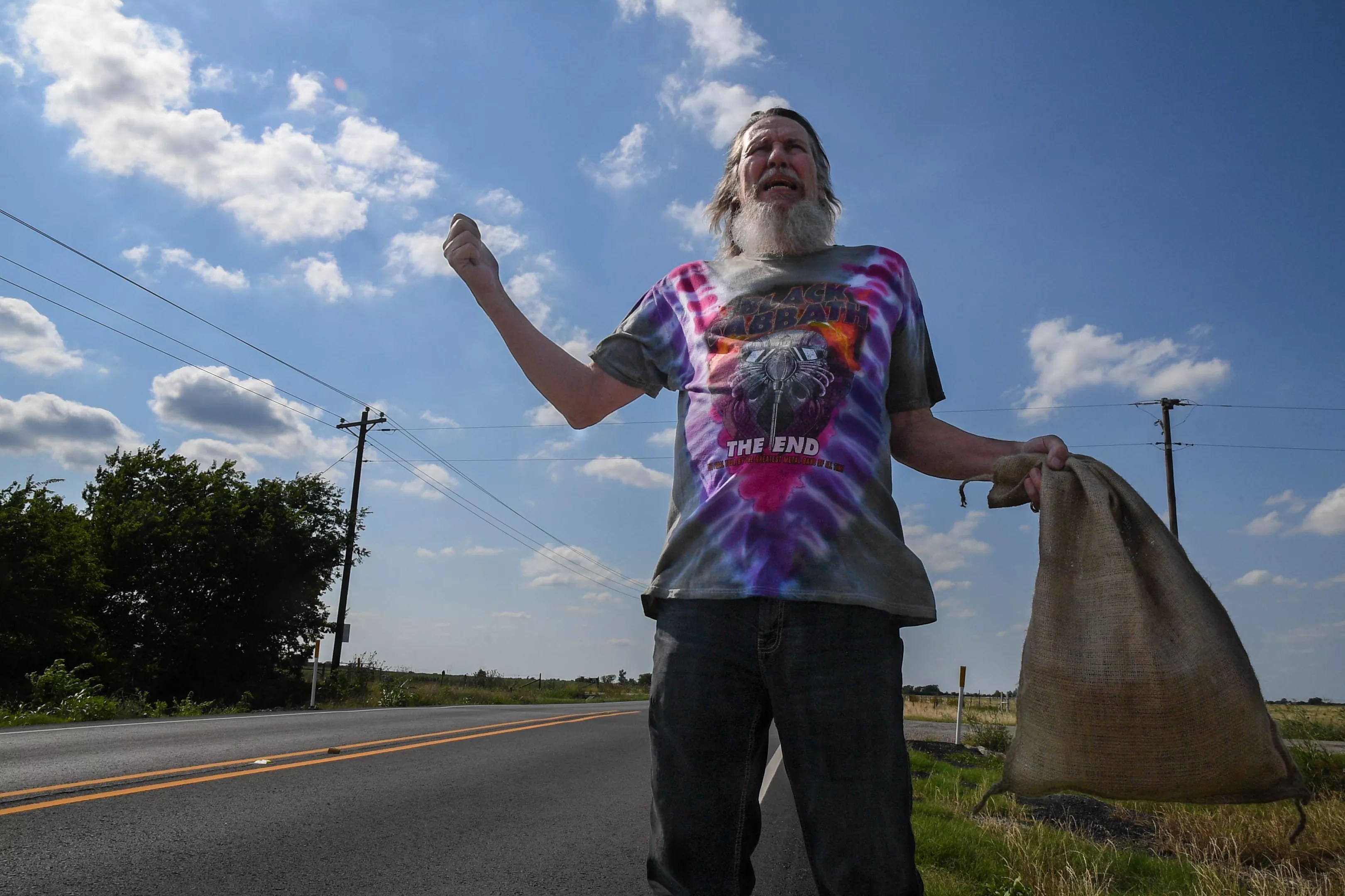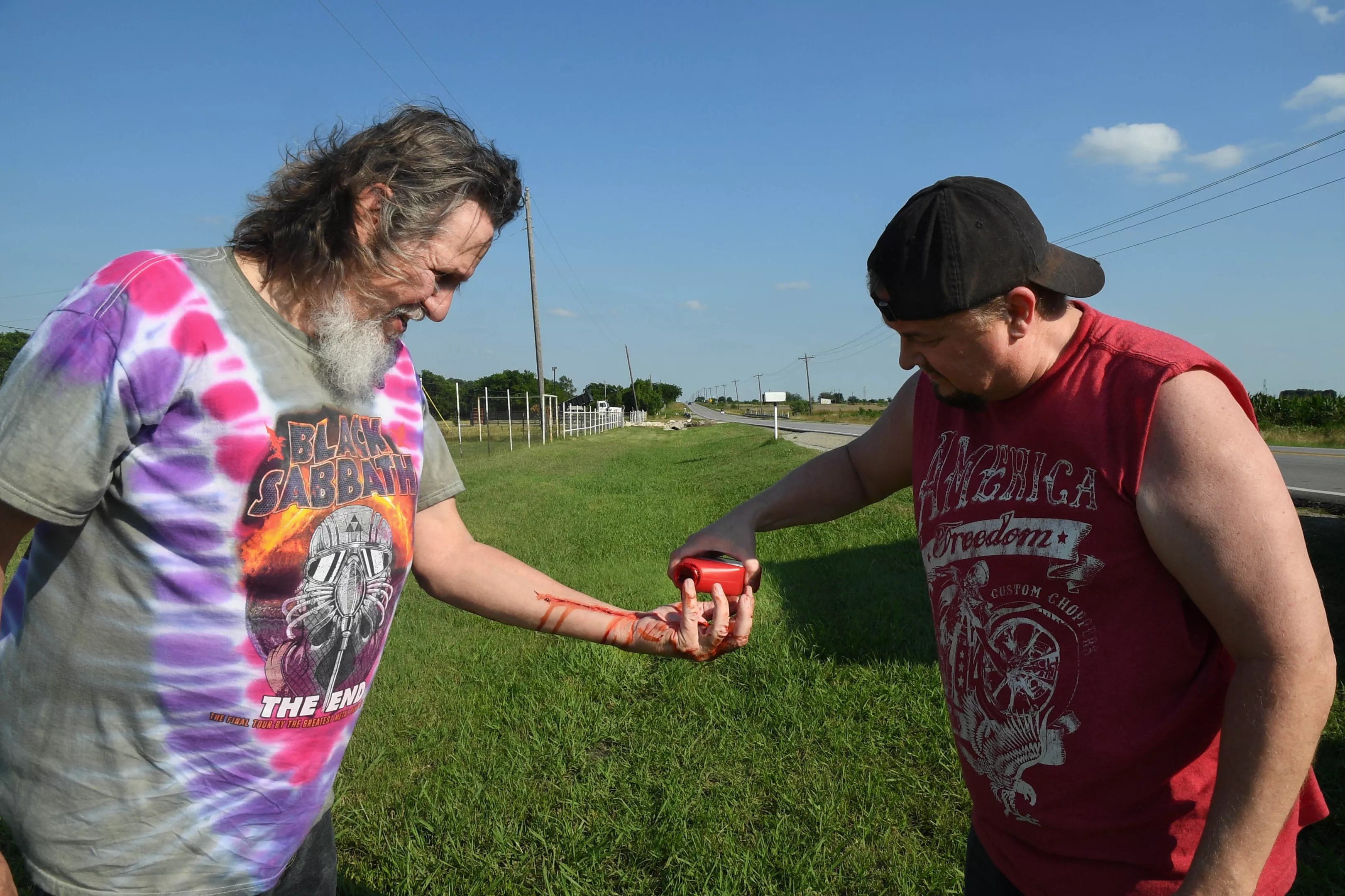Standing on the side of the road with his right thumb extended for a ride and windblown, shaggy gray hair, Neal looks more like a deranged old hippie on one too many drops of acid in a tie-dye Black Sabbath T-shirt that Corbitt had slipped him earlier at Sonic in town. The look simply adds to his performance as he spends the next couple of hours channeling the hitchhiker from Texas Chain Saw Massacre with Corbitt’s unique twist, one he’d rather you learn when the band showcases the video July 14 at its album release show at the Rail Club.