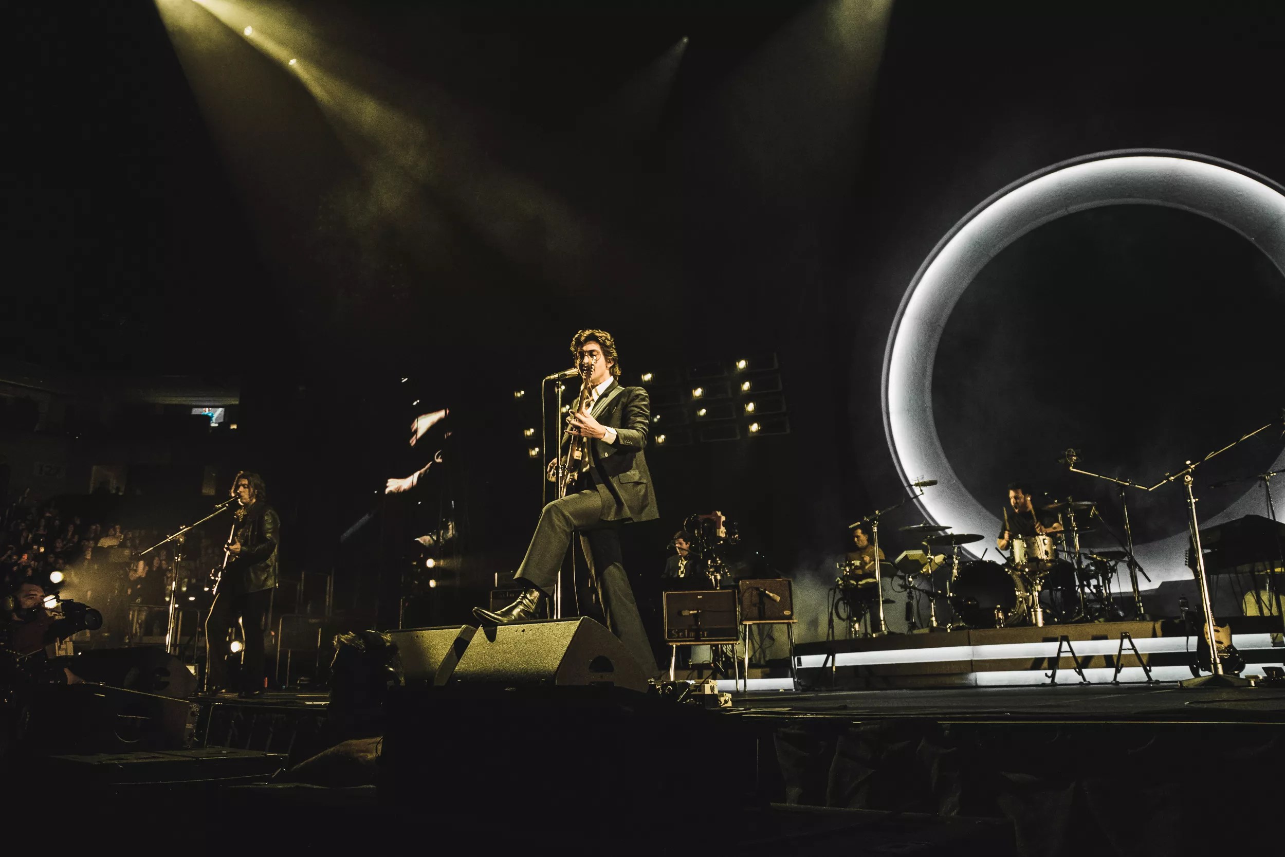 In alignment with The Car and 2018’s Tranquility Base Hotel and Casino‘s jazzy midcentury lounge vibe, frontman Alex Turner sported a leisure suit and aviators against a sort of retrofuturist backdrop. The show was filmed and projected on what appeared to be vintage TV studio cameras.