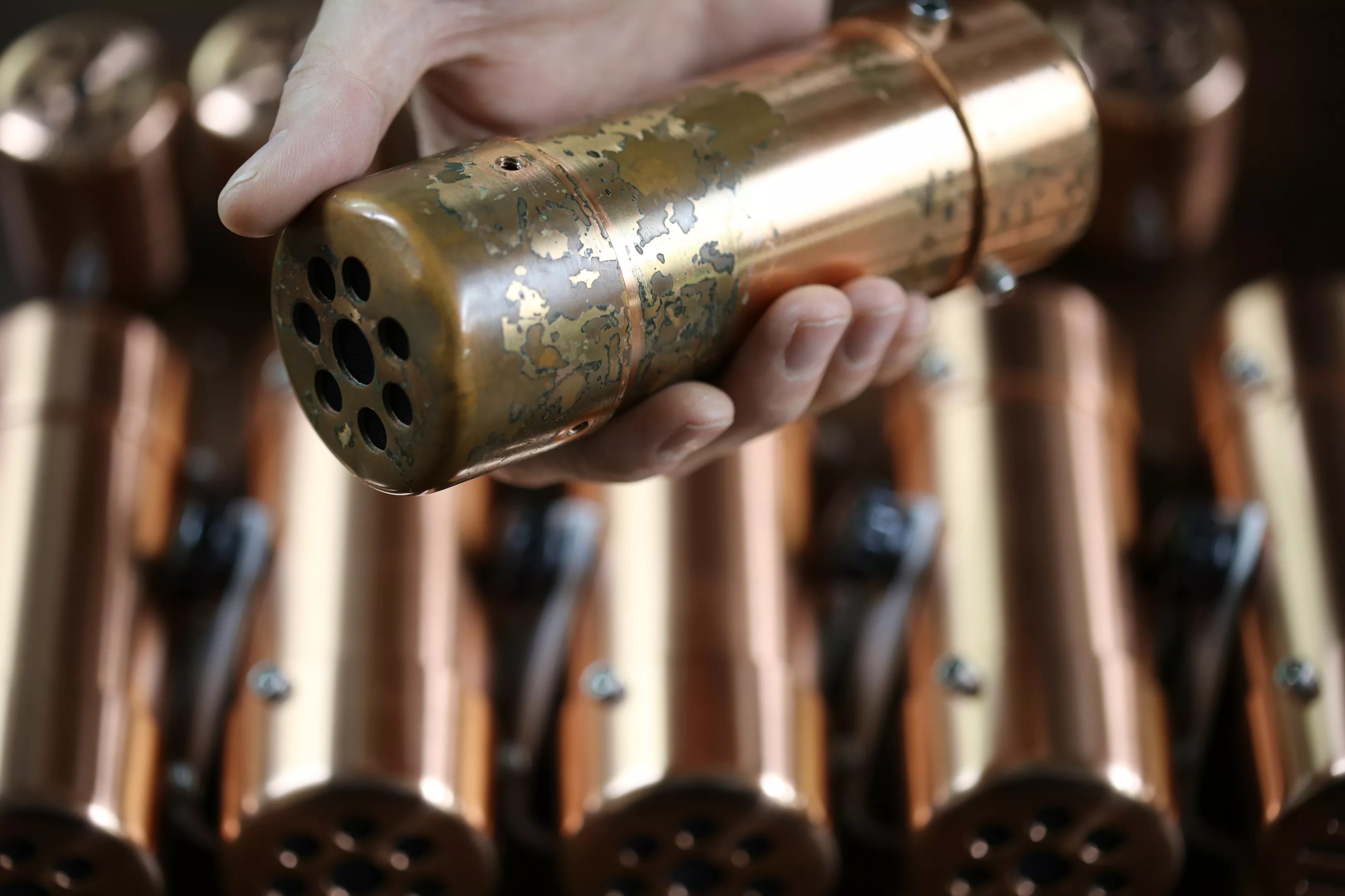 “There are different ways to get patinas. Let me show you something,” Pirro says, disappearing into a back corner near a table covered with polished copper tubes and half-assembled microphones. As he walks to the back, his voice trails off as he says, “I’ll show you the first Copperphone … .”