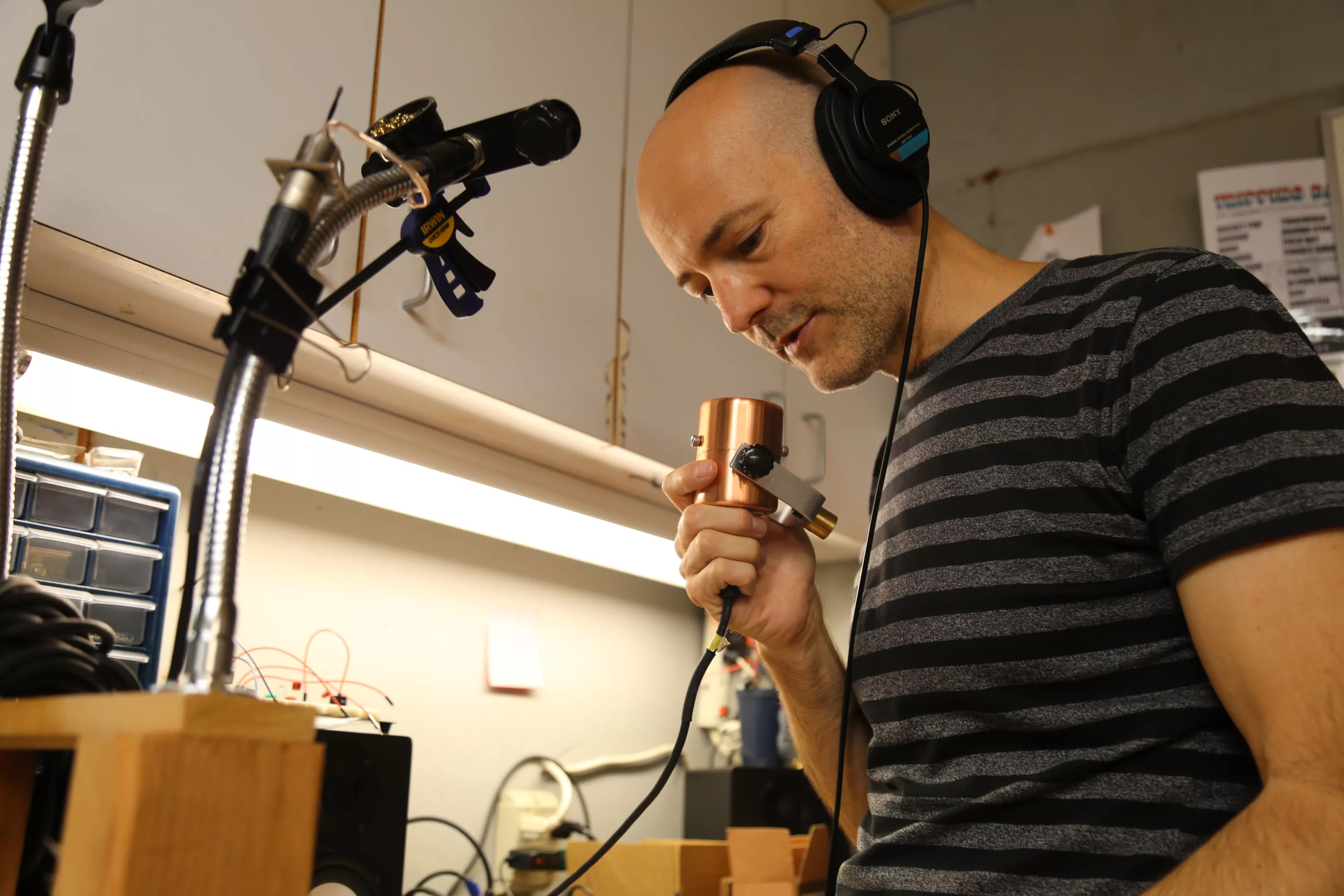 With a pair of headphones over his ears, Pirro holds a small copper mic in one hand while slowly twisting a knob on a mixer. “Check. Check,” his voice reverberates off the walls, sounding like a store’s public address system. He’s testing out the soon-to-be-released Carbonphone RU80, a newly designed microphone that utilizes decommissioned Cold War-era Soviet military components.