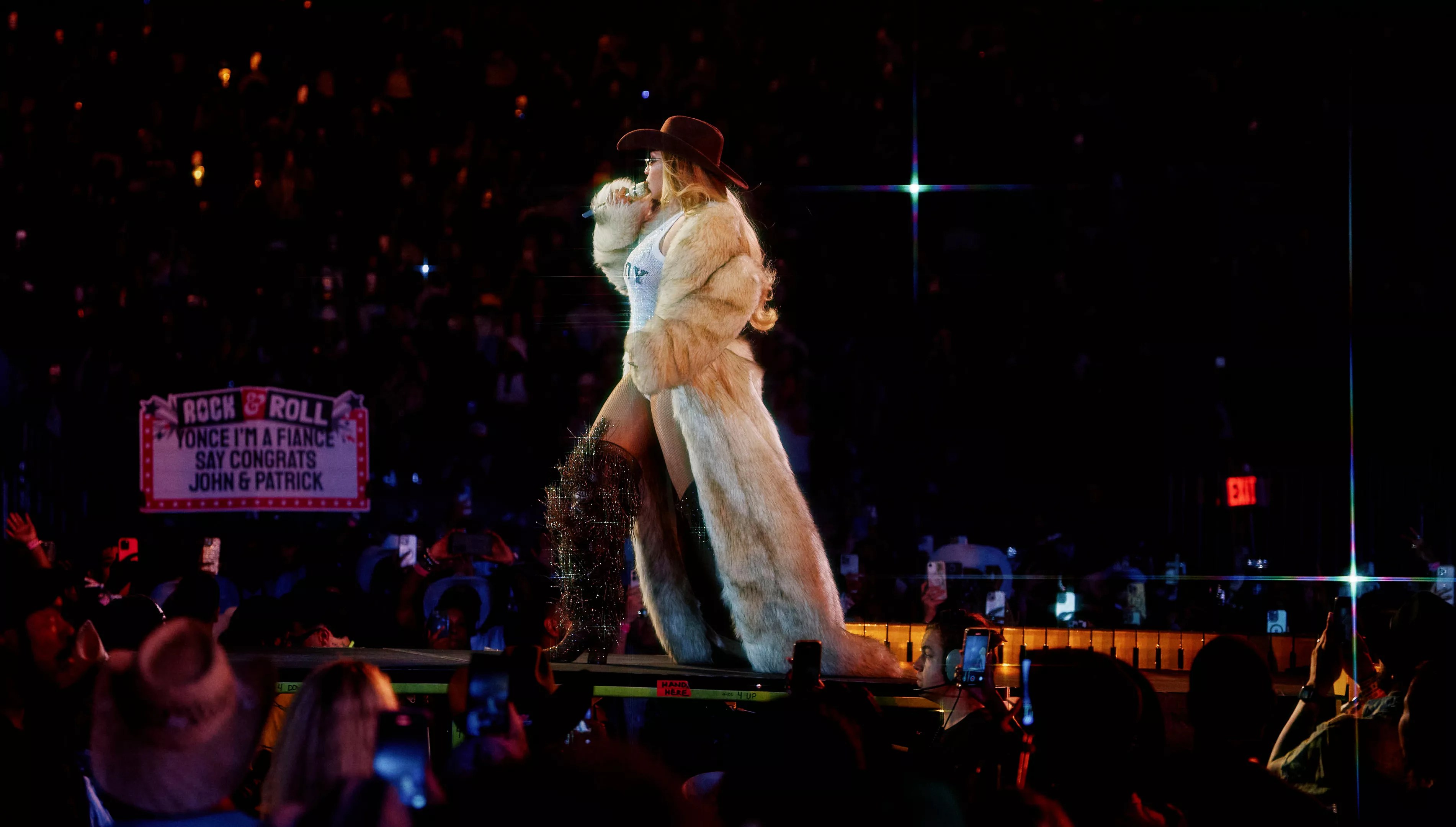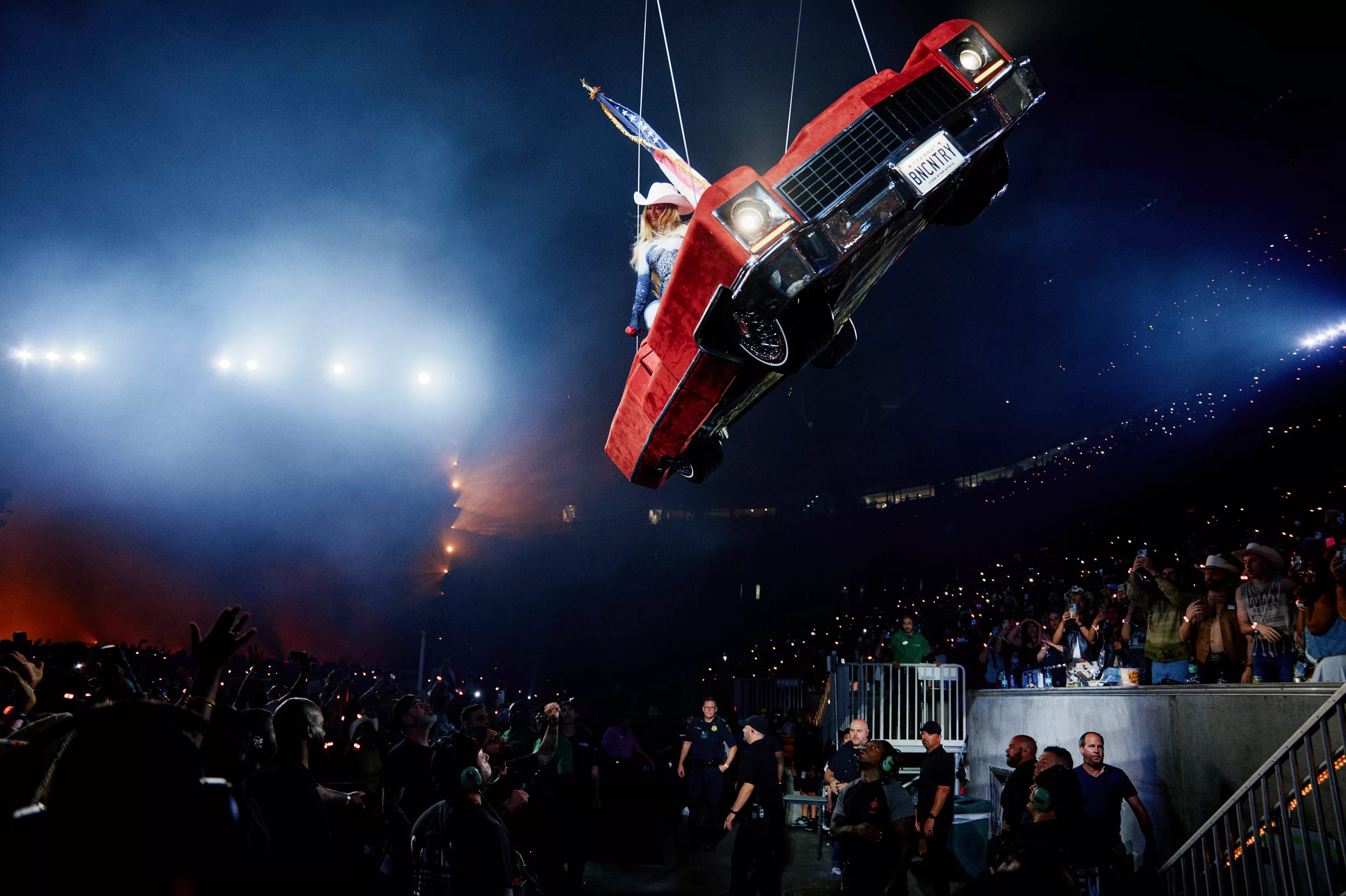 Off-screen, there’s no shortage of stunts. During performances of her remake of Dolly Parton’s “Jolene” and her Lemonade country ballad “Daddy Lessons,” Bey zips throughout the stadium on a giant, floating horseshoe.