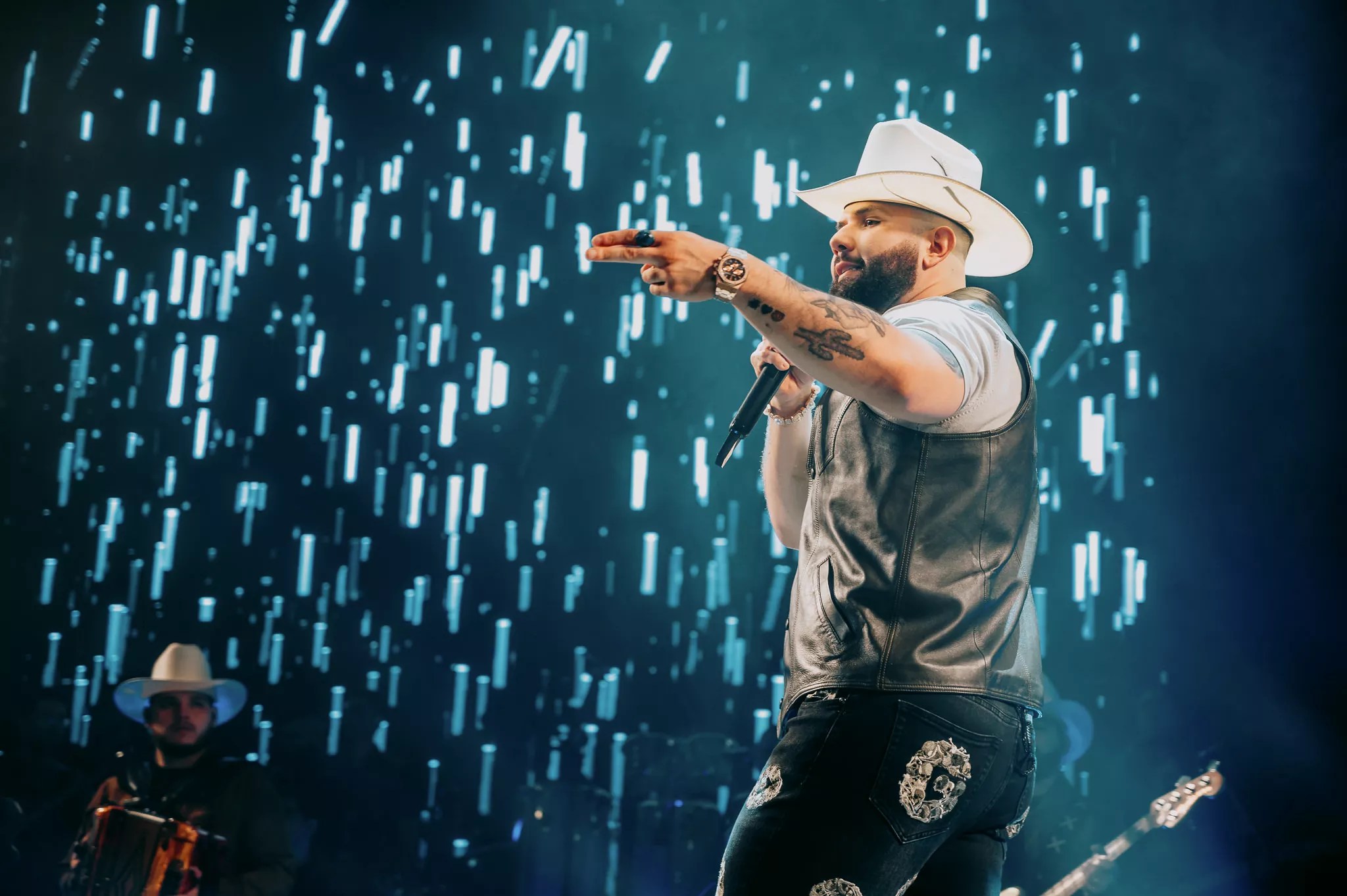 While performing, León shares the stage with more than a dozen musicians who represent a wide variety of styles, including norteño, banda, country, jazz, salsa and other Latin sounds.