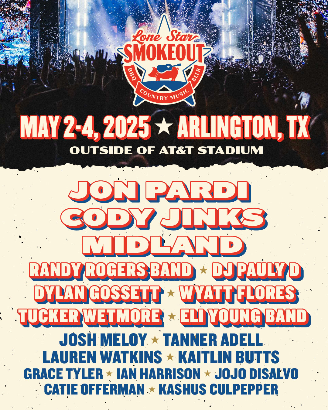 The three-day festival will take place May 2-4, with headliners Jon Pardi, Cody Jinks and Midland. Among the 15 other country music acts are Wyatt Flores, Eli Young Band, Kaitlin Butts and, for some reason, DJ Pauly D.