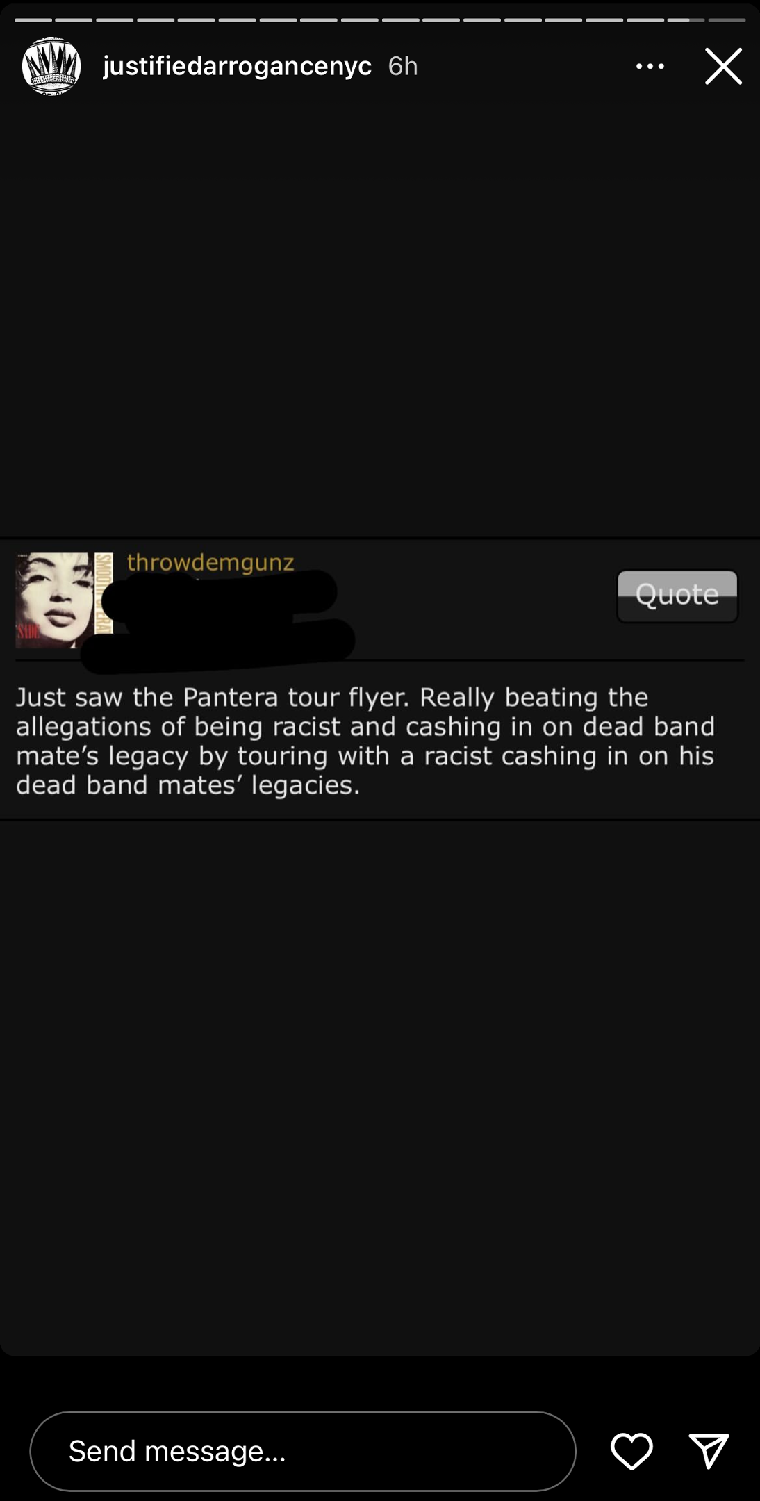 Authoritative music blog Justified Arrogance posted a screenshot from a privately maintained message board insisting the band was “cashing in [a] dead band mate’s legacy”. Screenshot via Instagram