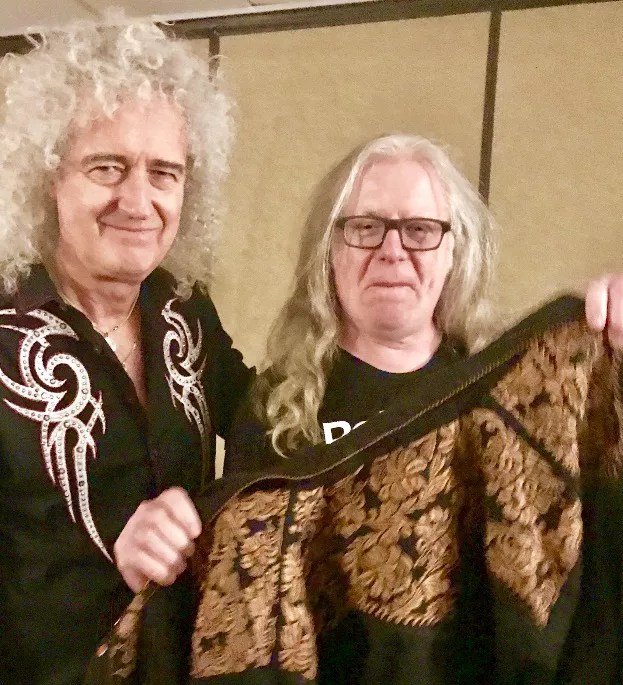 Bucks Burnett presents Queen guitarist Brian May with the shirt off his back.