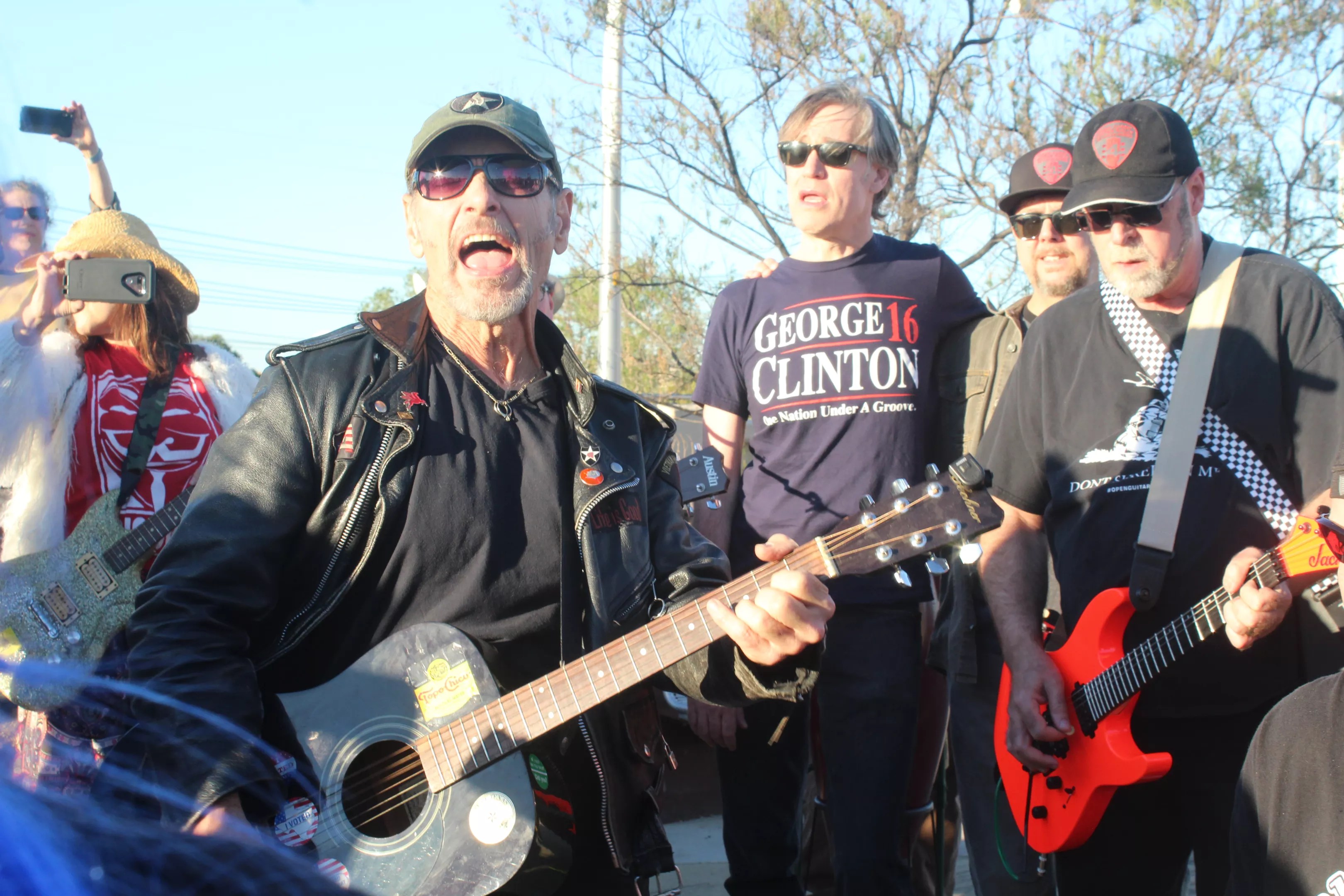 This year’s spectacle culminated when rallygoers called for Kooda to lead David Bowie’s “Heroes.” He ambled to the middle of the jam circle and strummed his stickered guitar. Others caressed chords and sang altogether, “We can beat them, just for one day. We can be heroes, just for a day.”