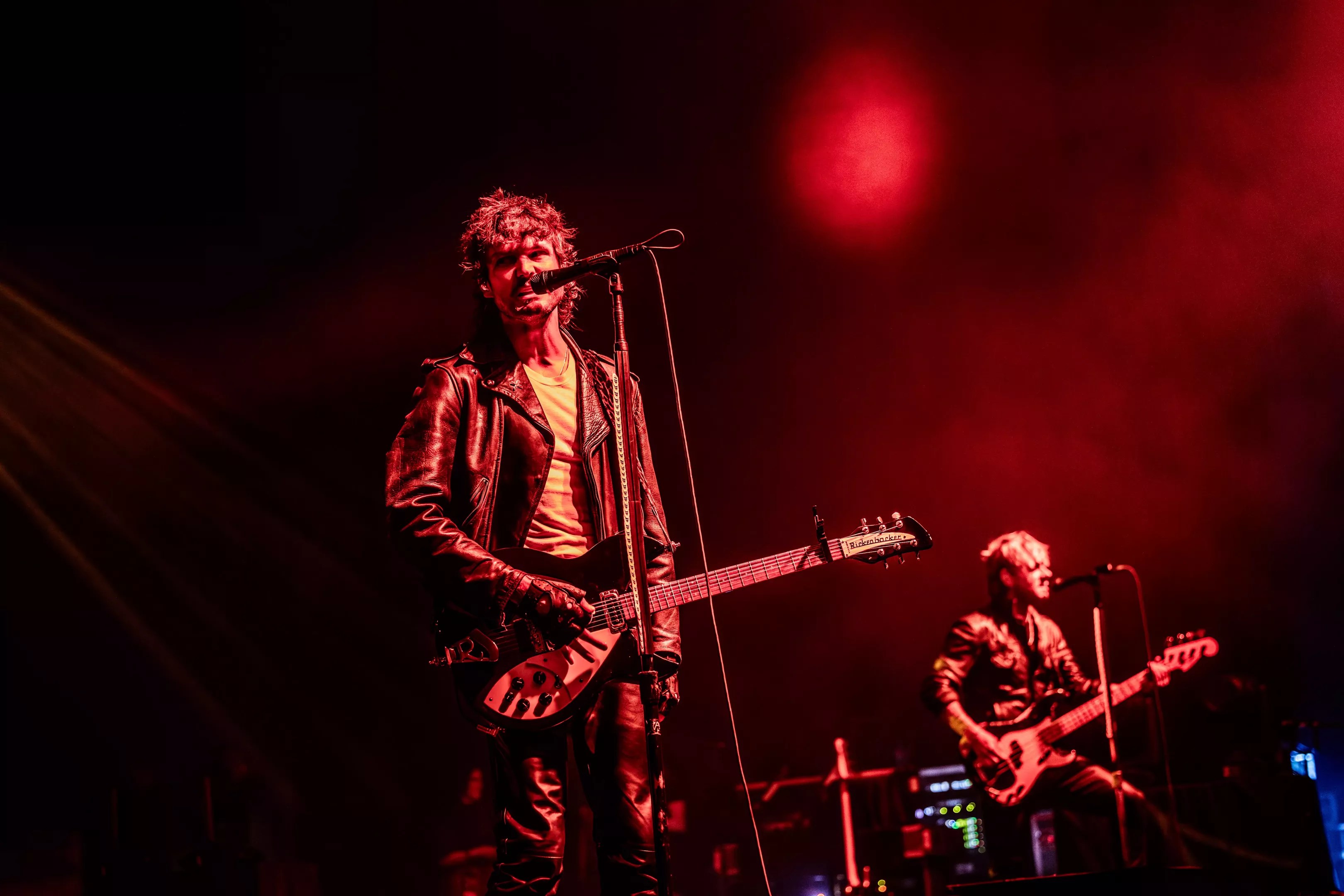 All three front mic stands were lined three-quarters of the way up with guitar picks. Two large black boxes placed between the mic stands turned the show into a pose-fest and a pick-throwing bonanza.