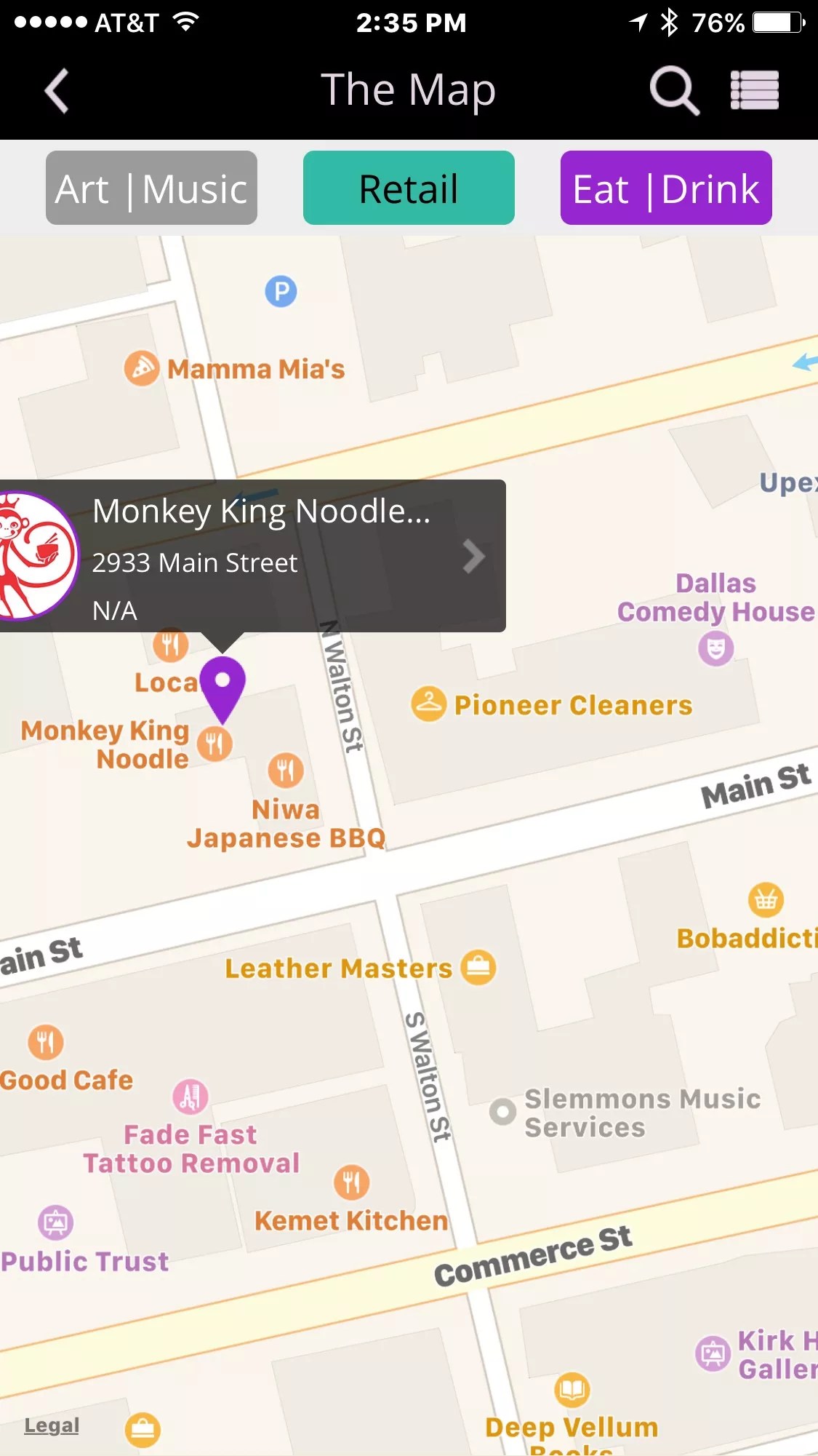 An “In the News” section is an aggregated list of stories from local and national news sources, including the one you’re reading right now. If you’re trying to find your way around Deep Ellum, the map can point you in the right direction. If you zoom in closely, you can see icons representing the different establishments.