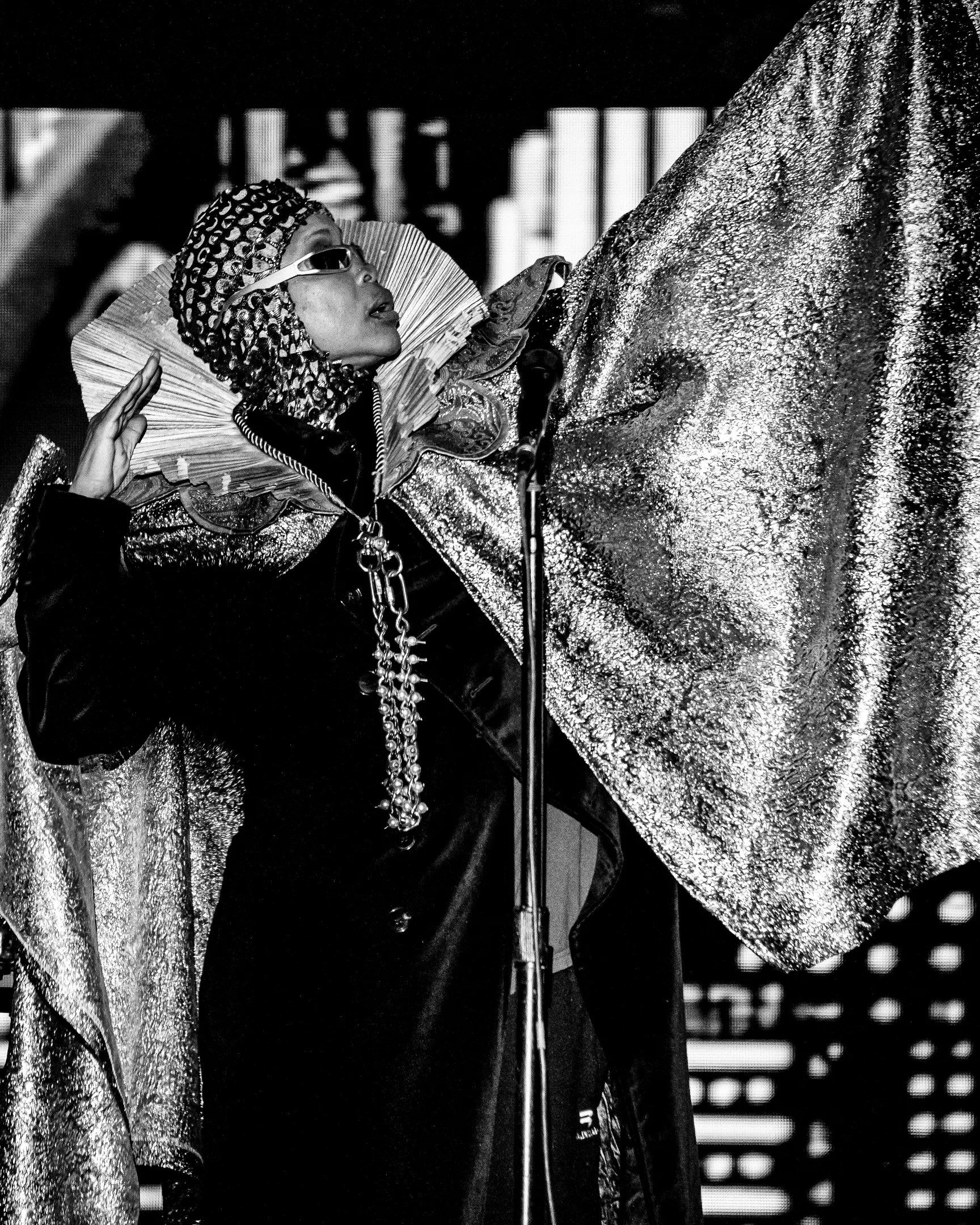 Transporting the audience to an Afro-futuristic Badu-world, Erykah – adorned in a cape, ultra-modern shades and her signature grill – opened the set with her new song “Echos 19 (mix 122),” singing of culturally resonant themes of religion, equality, unity and love. “After everything, we’re all the same,” she sang. “All under the same constitution, same pollution, same confusion, same institution, same simulation…” In honor of Juneteenth, it became crystal clear that Erykah had something to say.